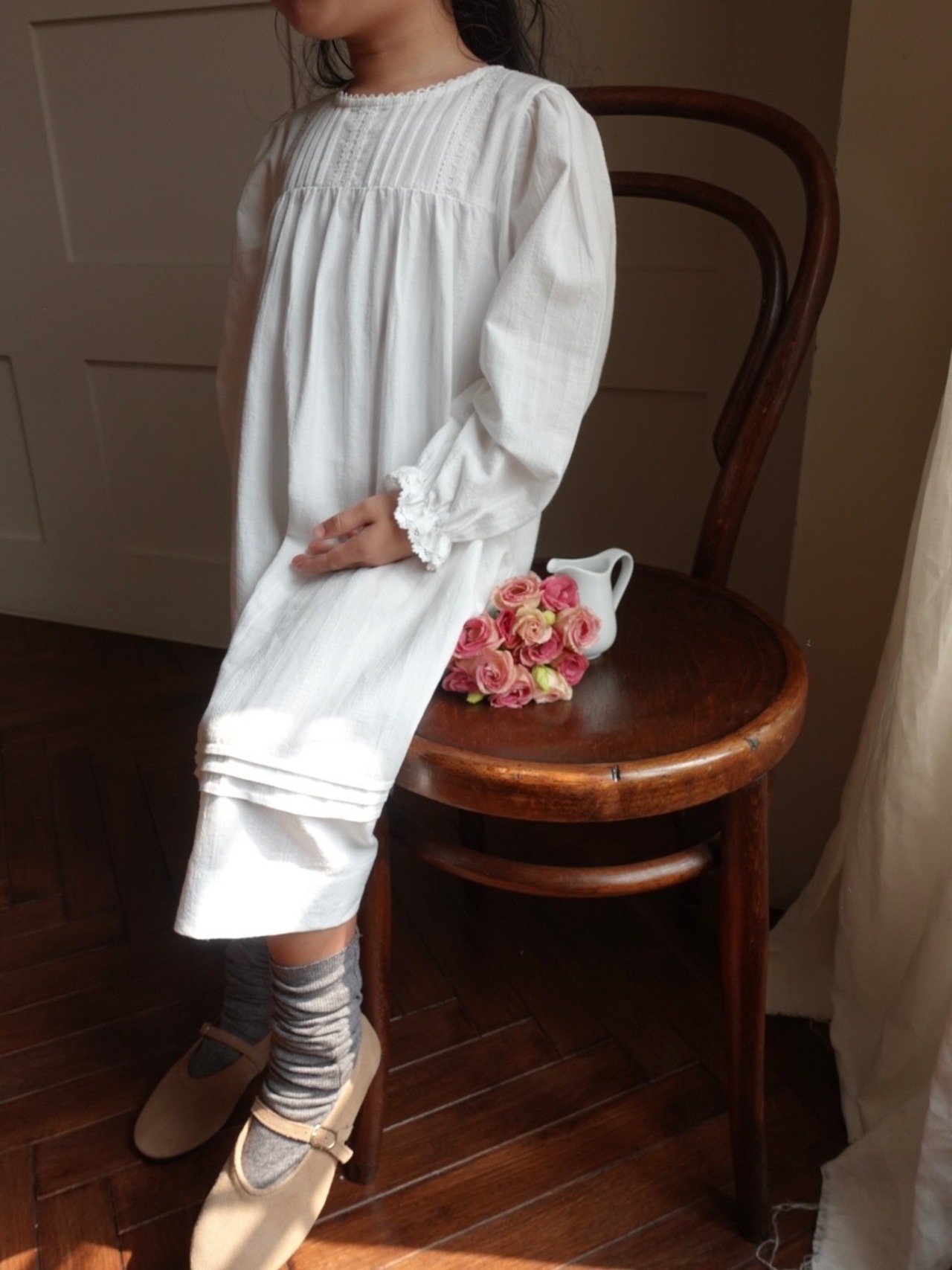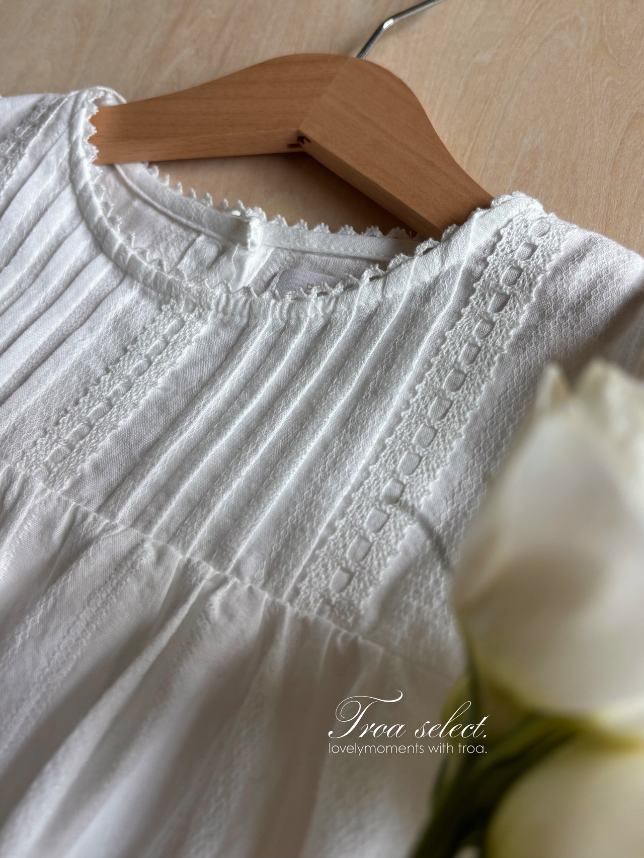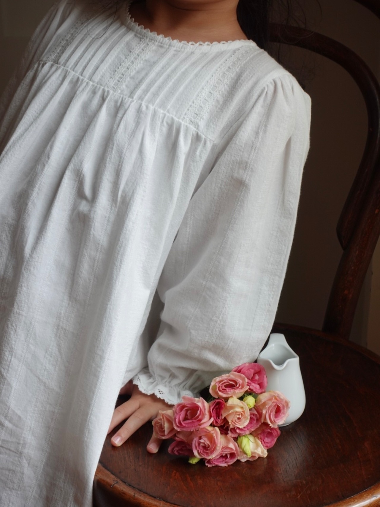 繊細なピンタックとレースのディテールが際立つクラシカルなホワイトドレス。