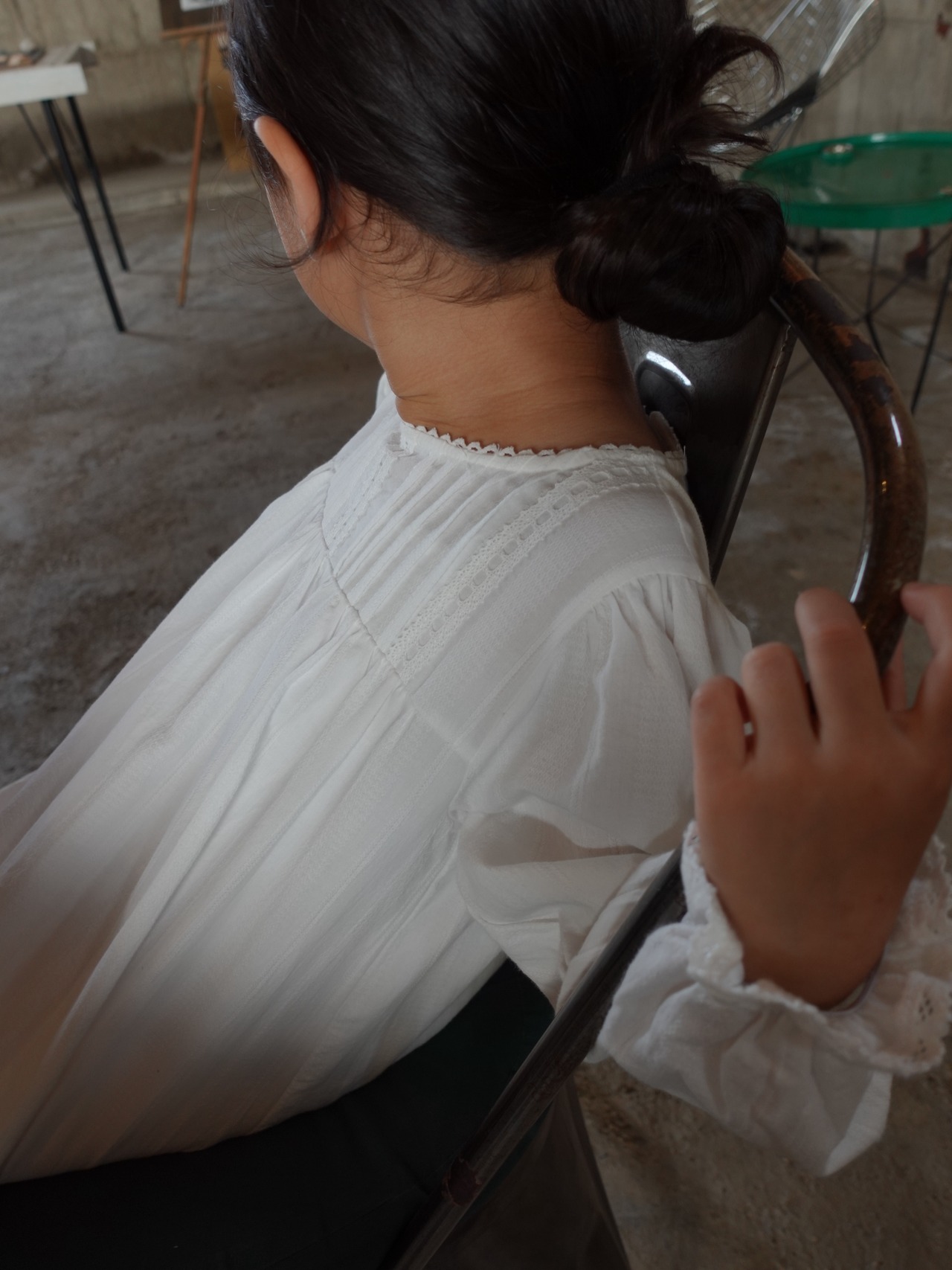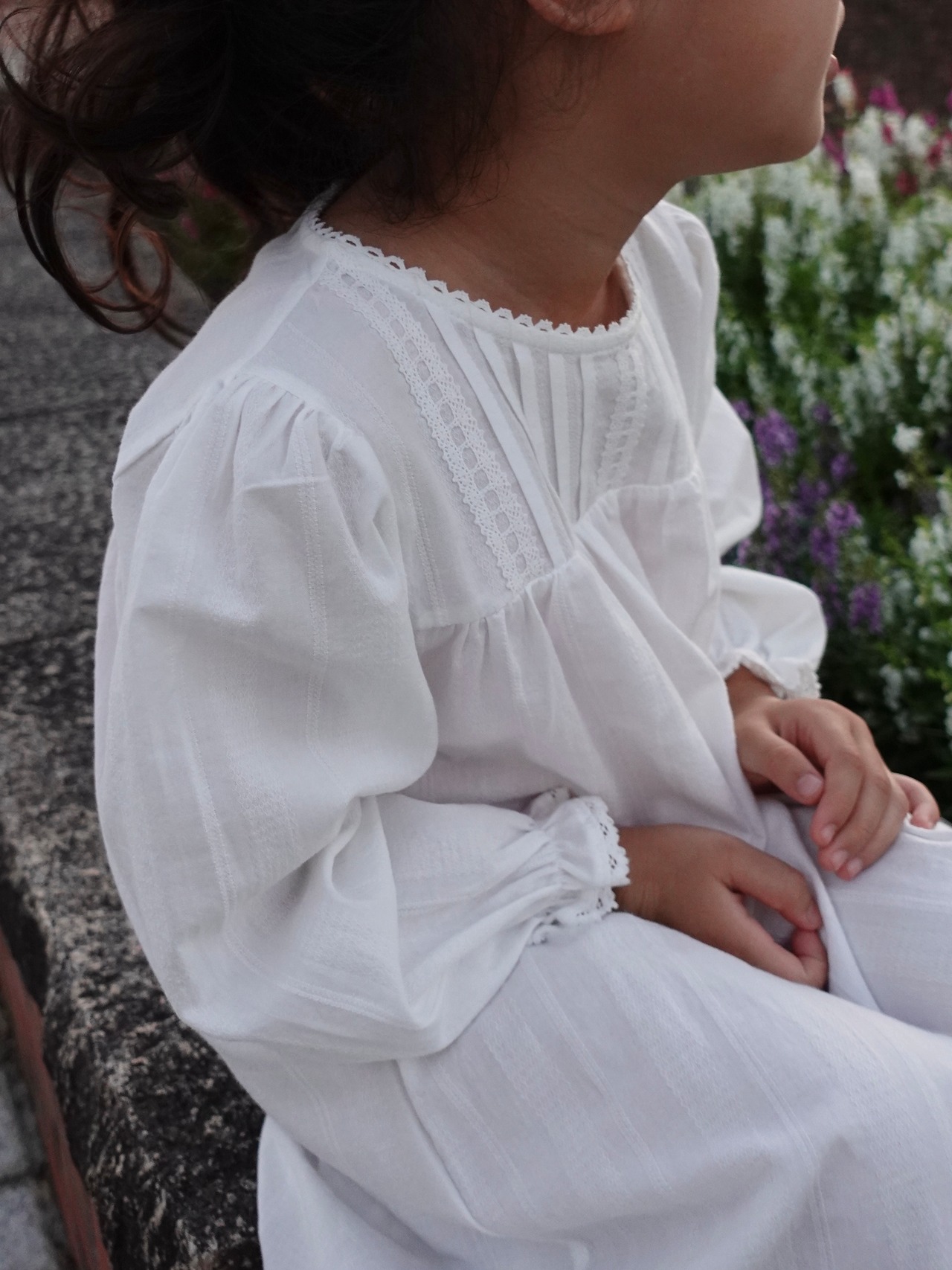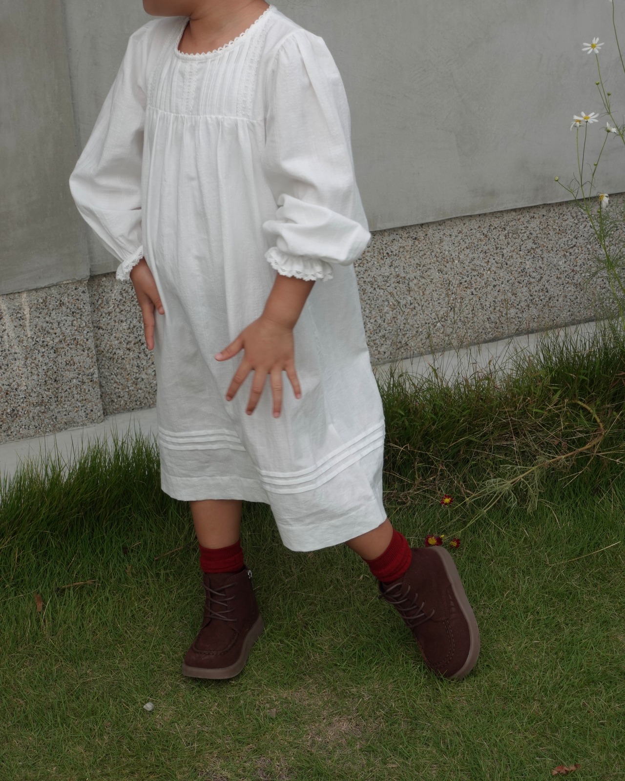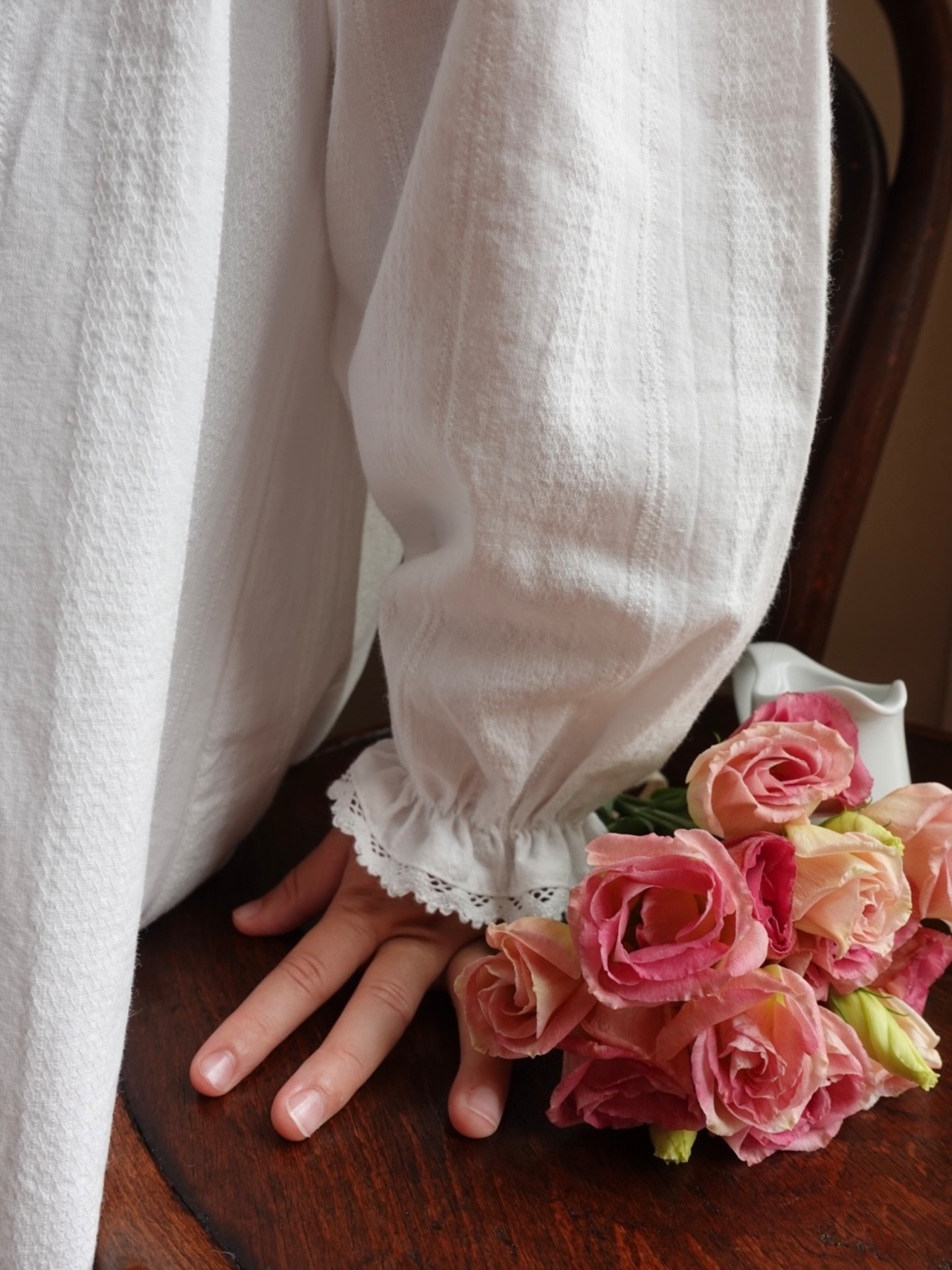 繊細なピンタックとレースのディテールが際立つクラシカルなホワイトドレス。