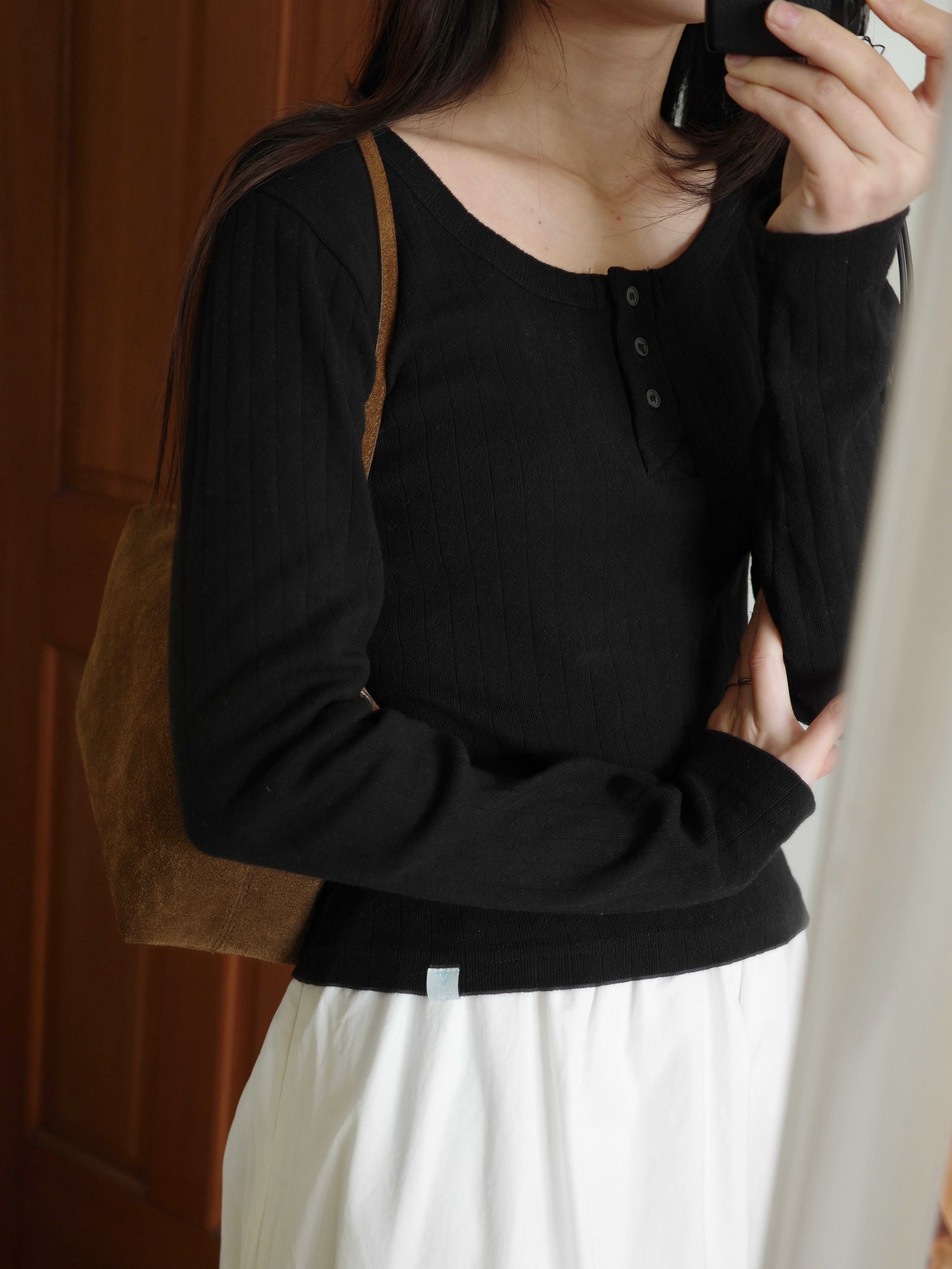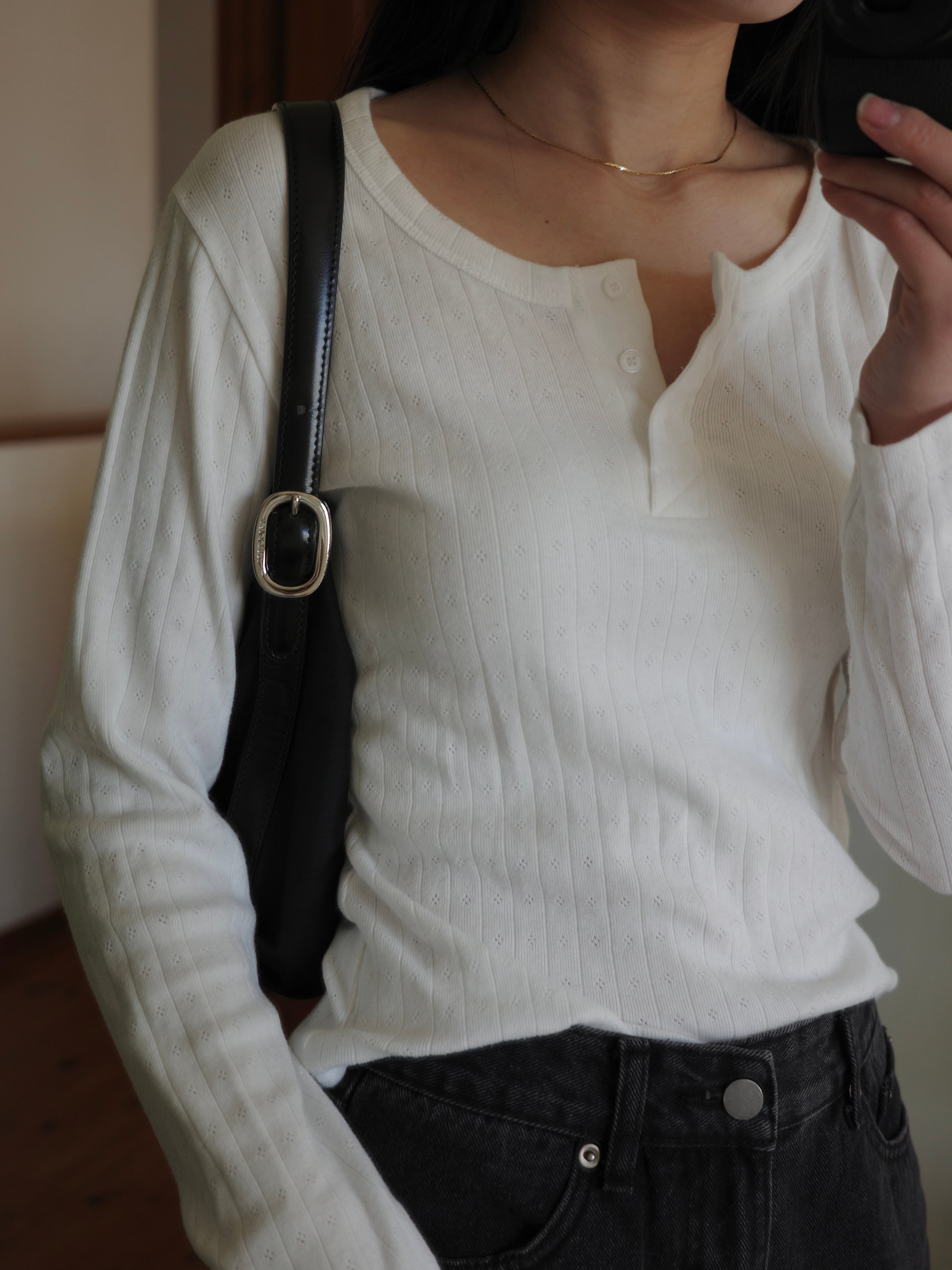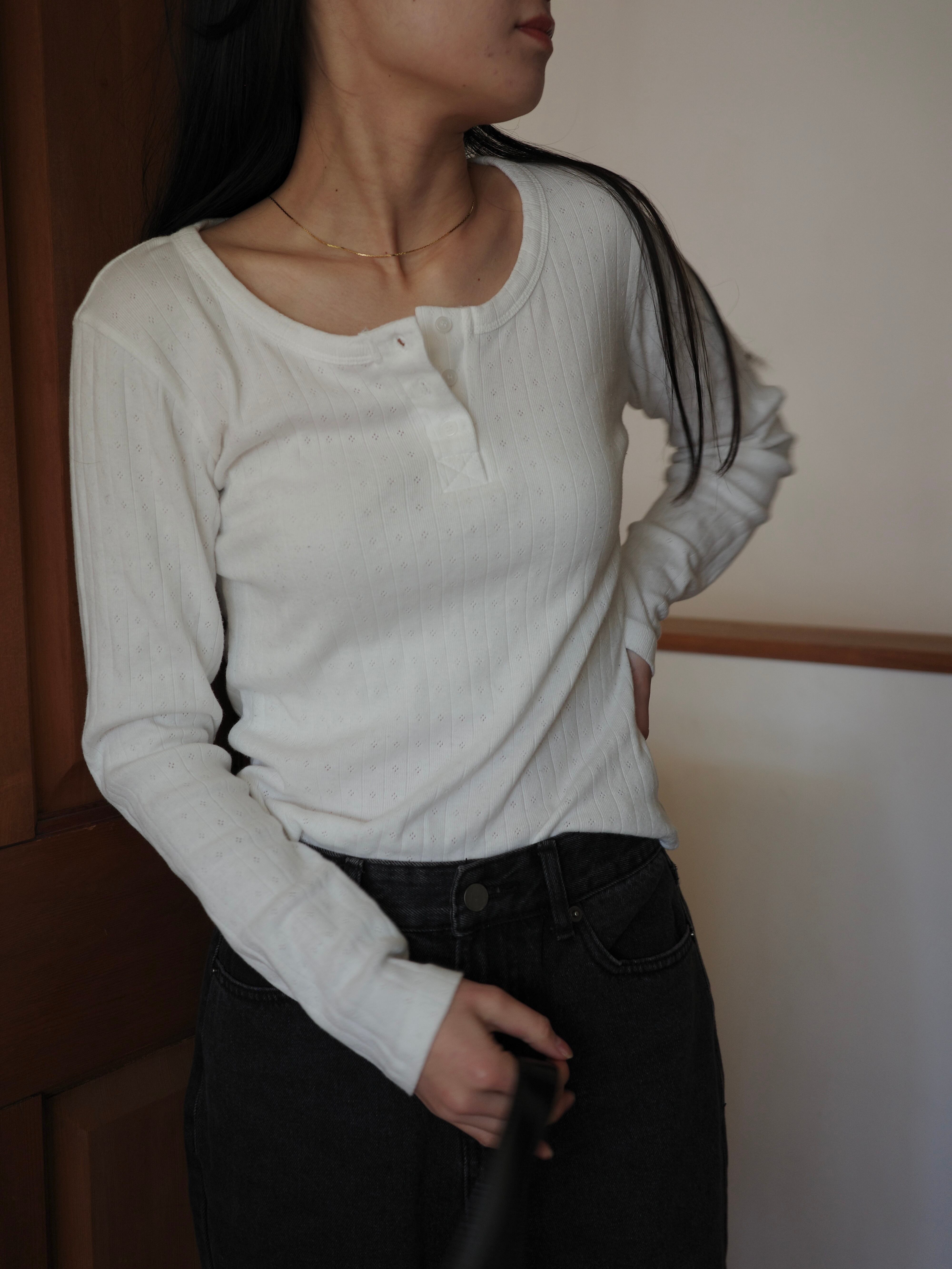 ヘンリーネックのさりげないディテールが、シンプルな装いにニュアンスを添えます。