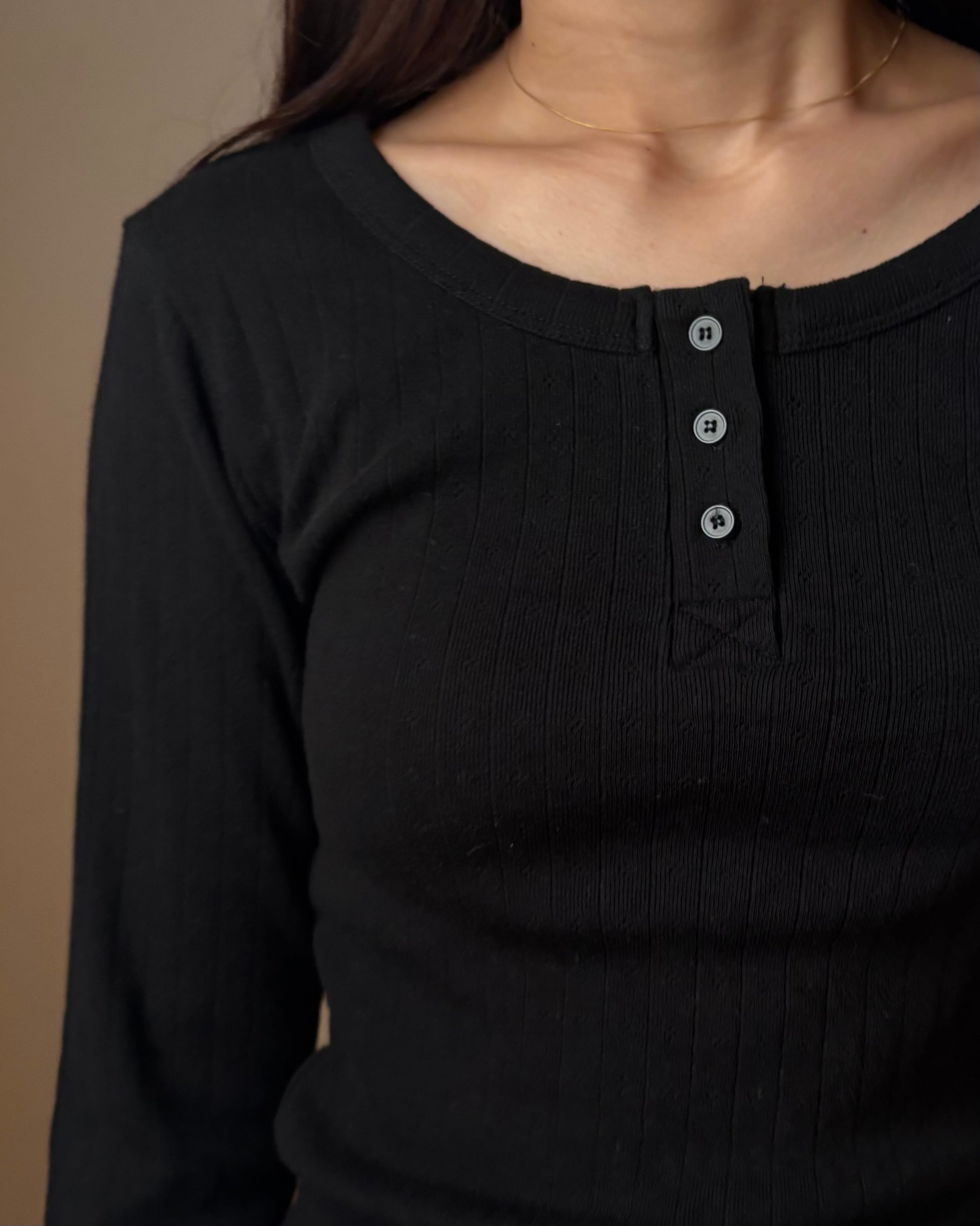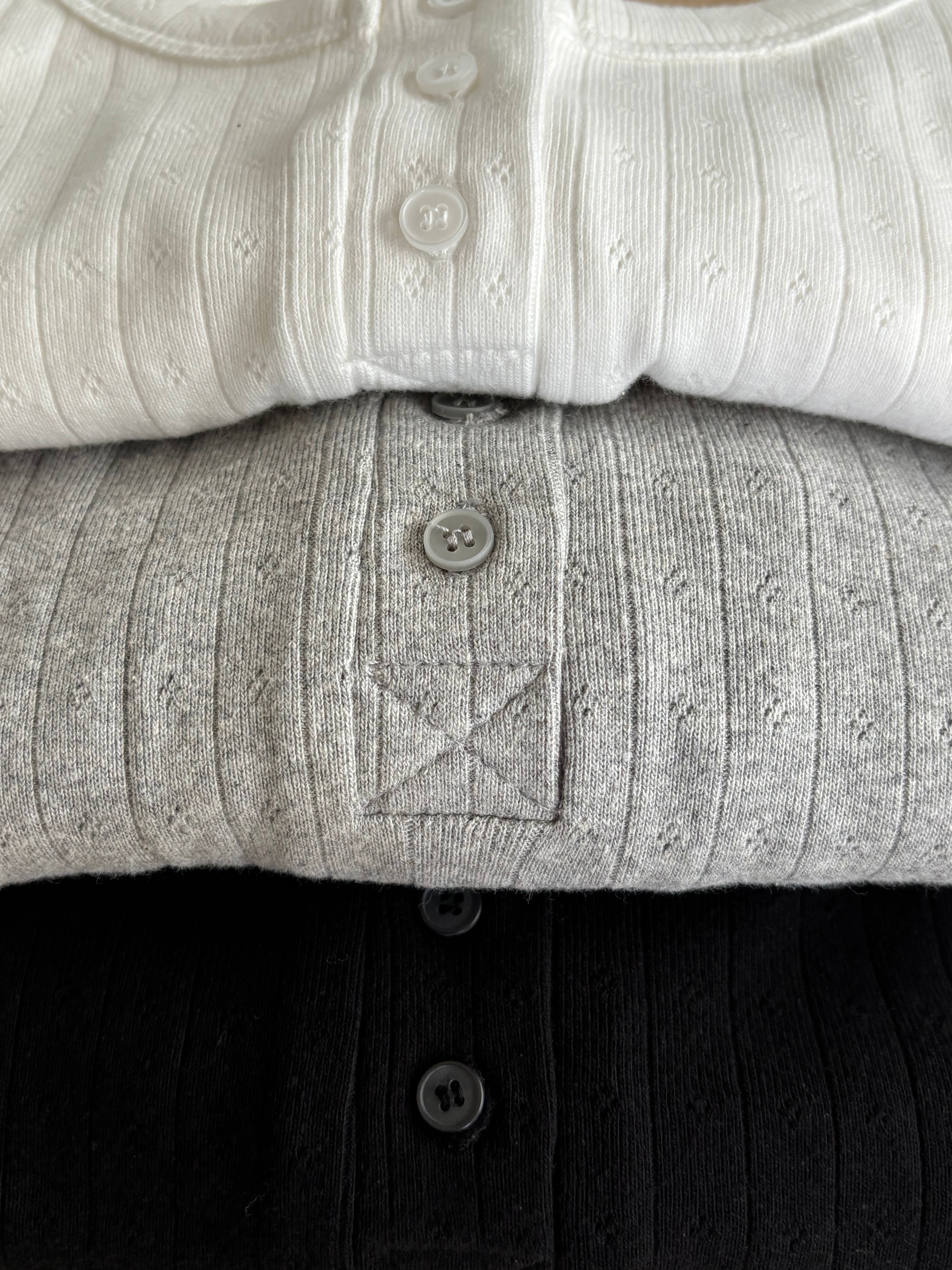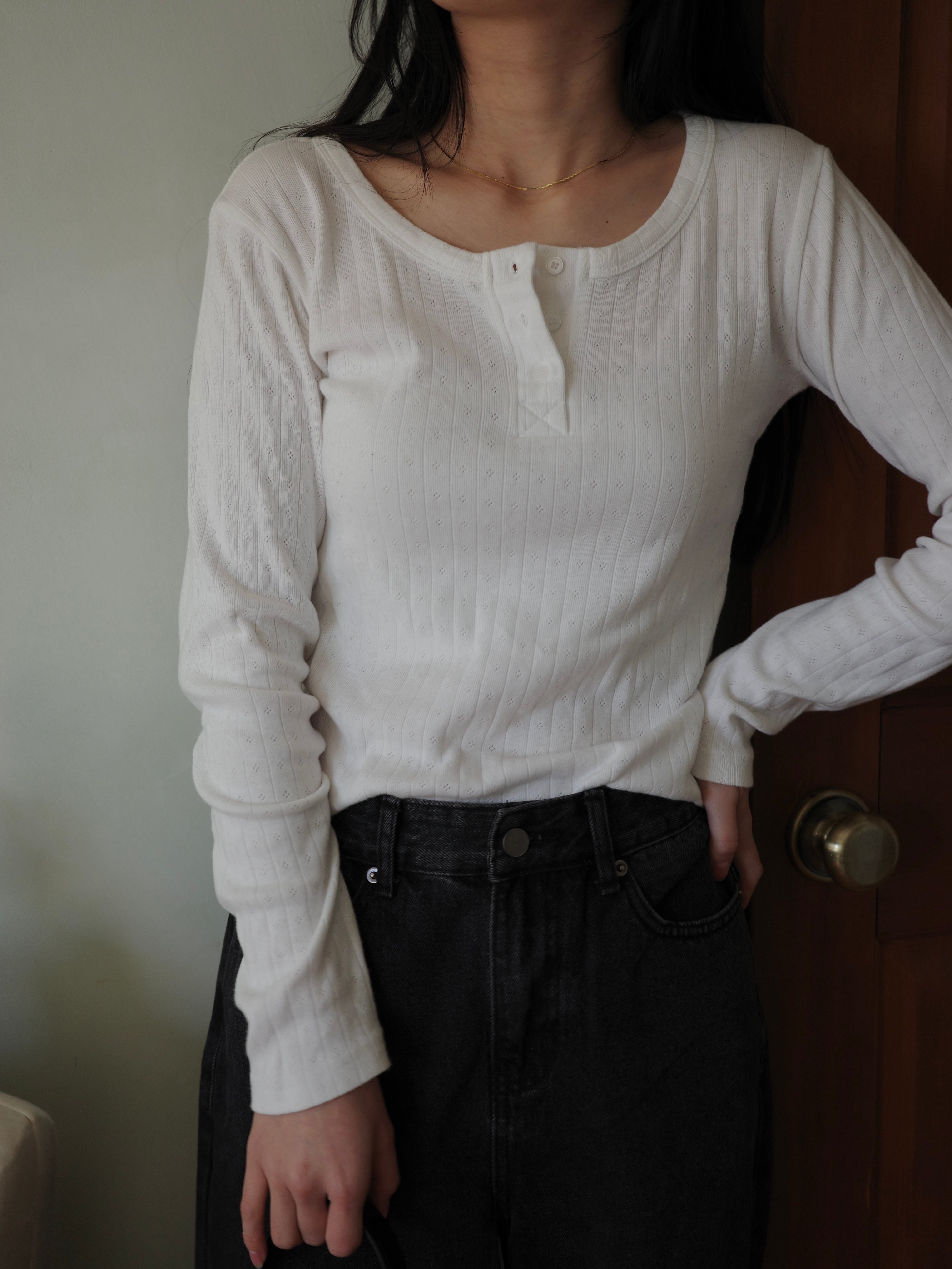 ヘンリーネックのさりげないディテールが、シンプルな装いにニュアンスを添えます。