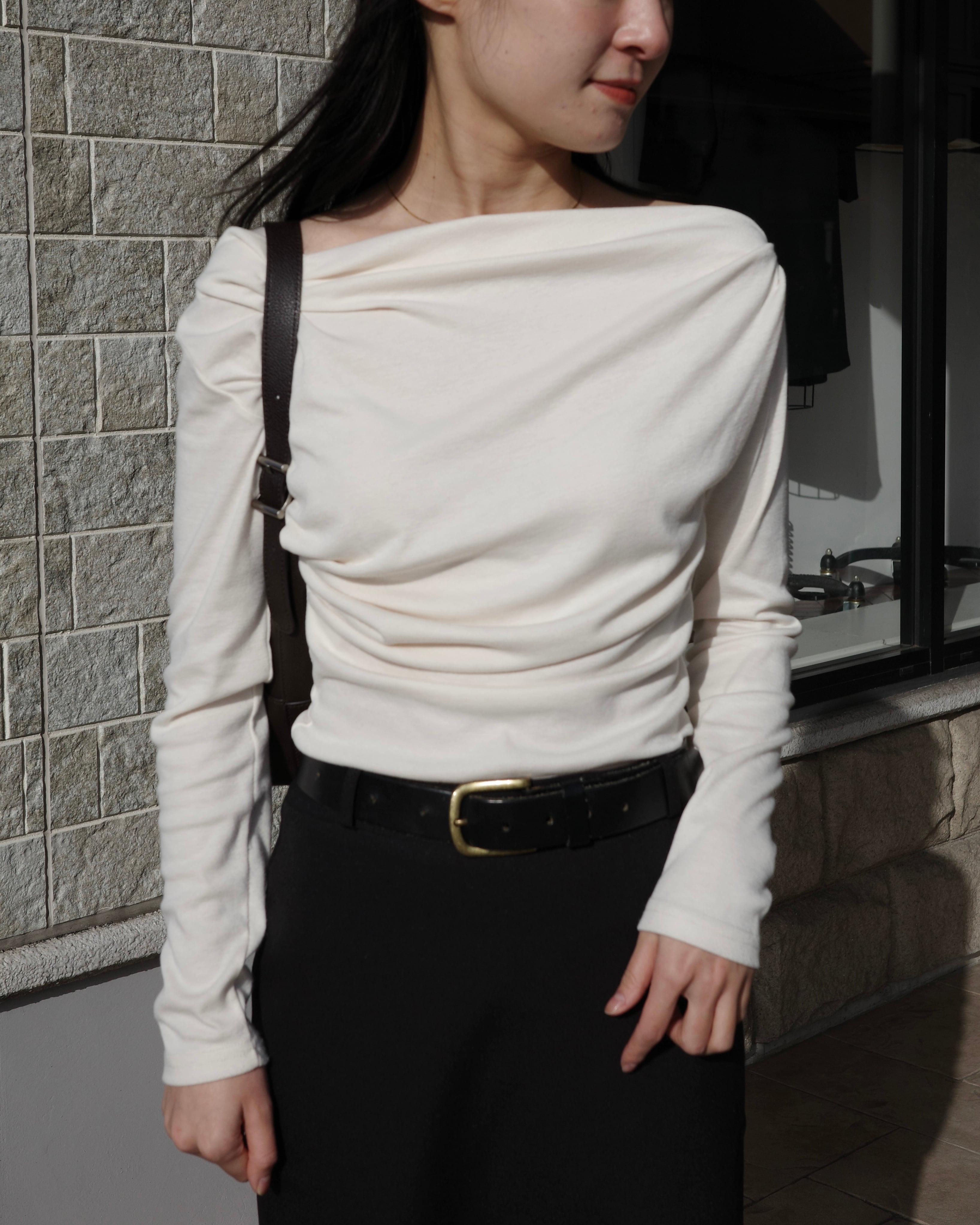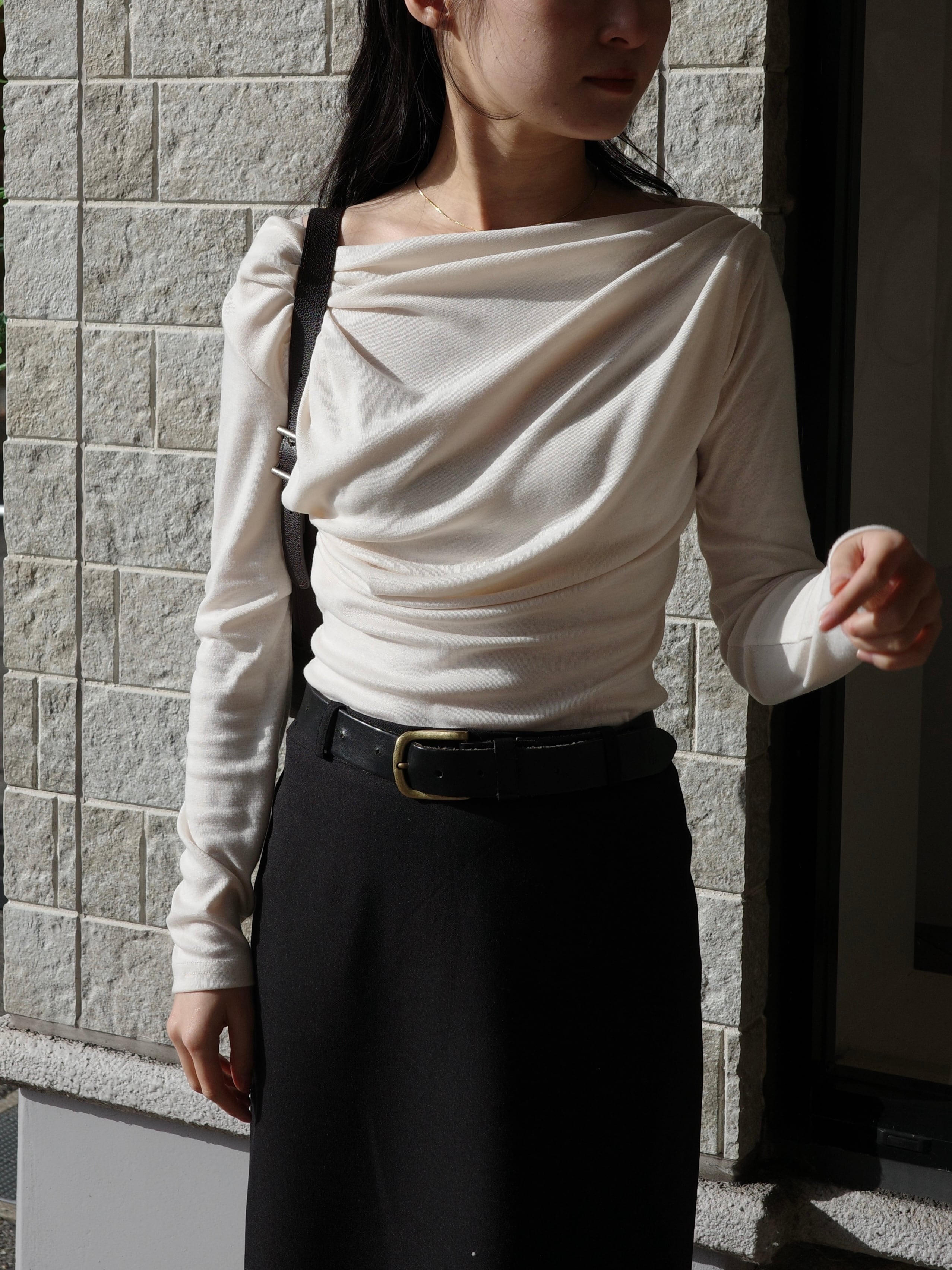 上品なドレープラインが美しい、ワンショルダーデザインのカットソー。