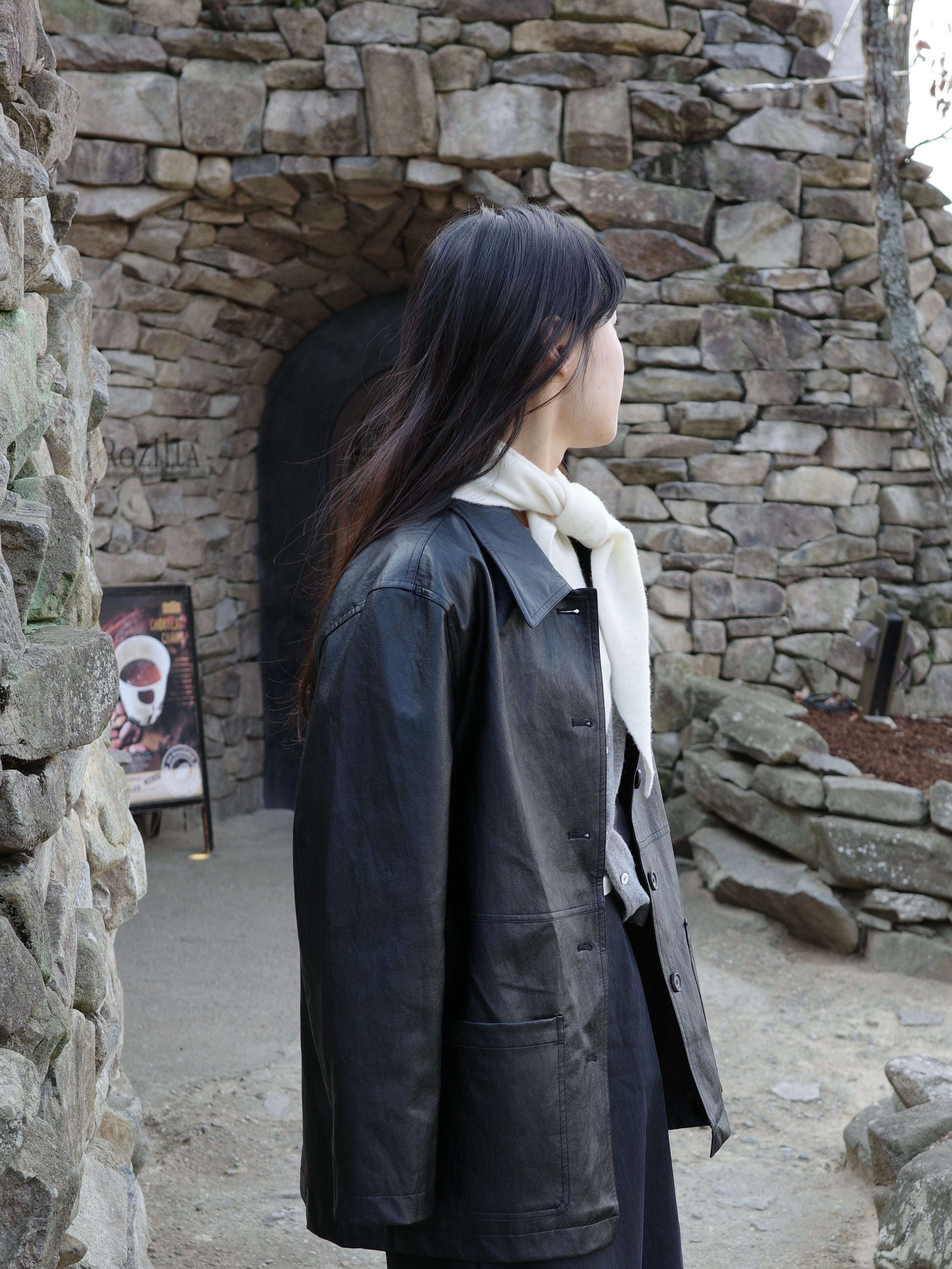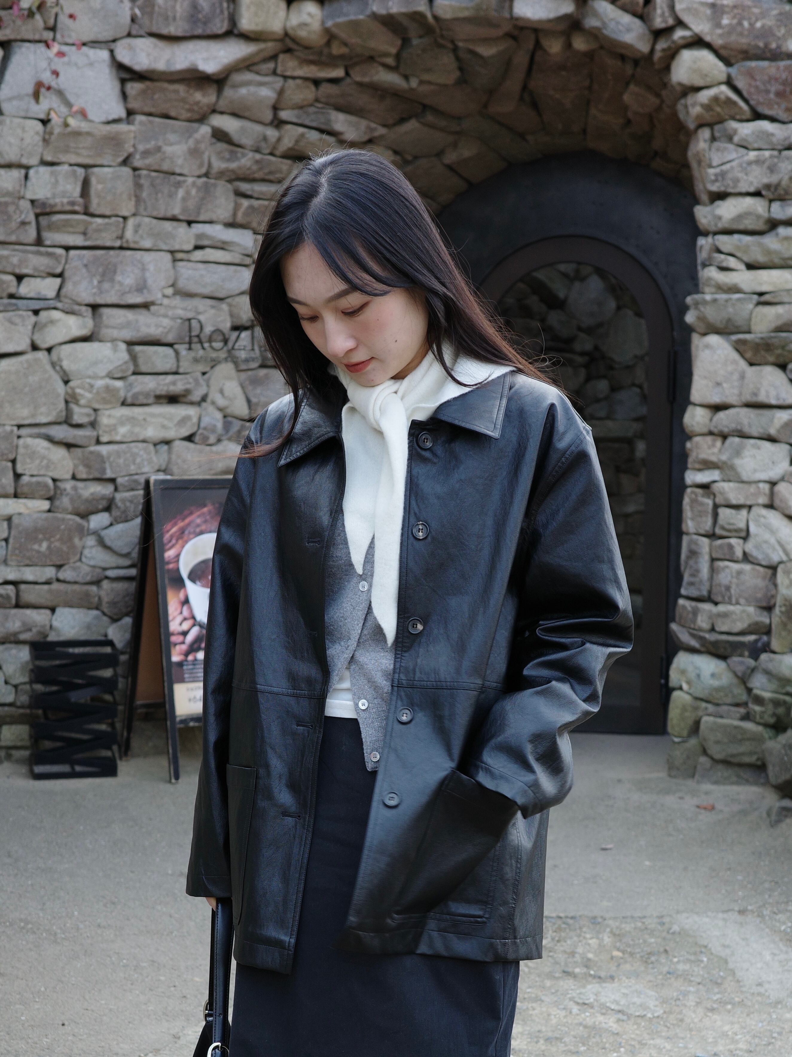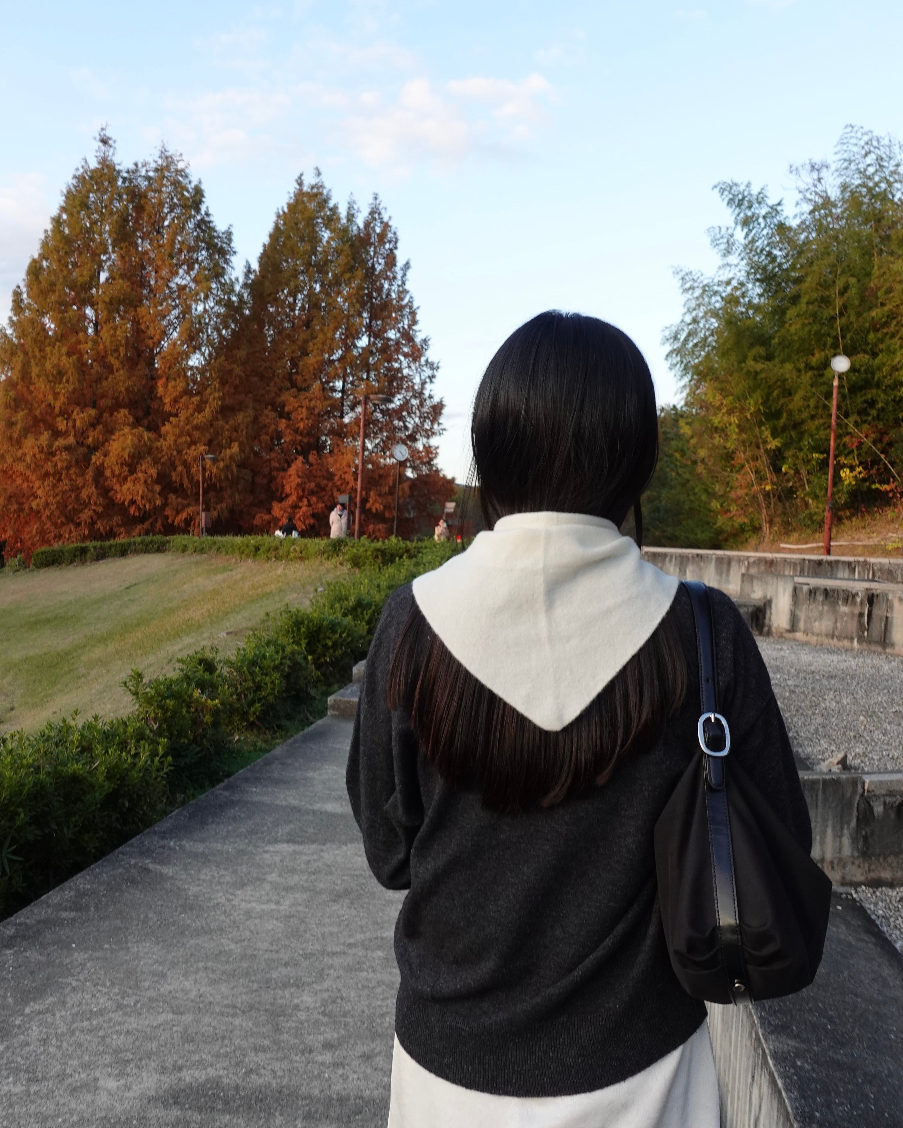 秋から春まで、温度調節に便利なニット素材の三角スカーフ。