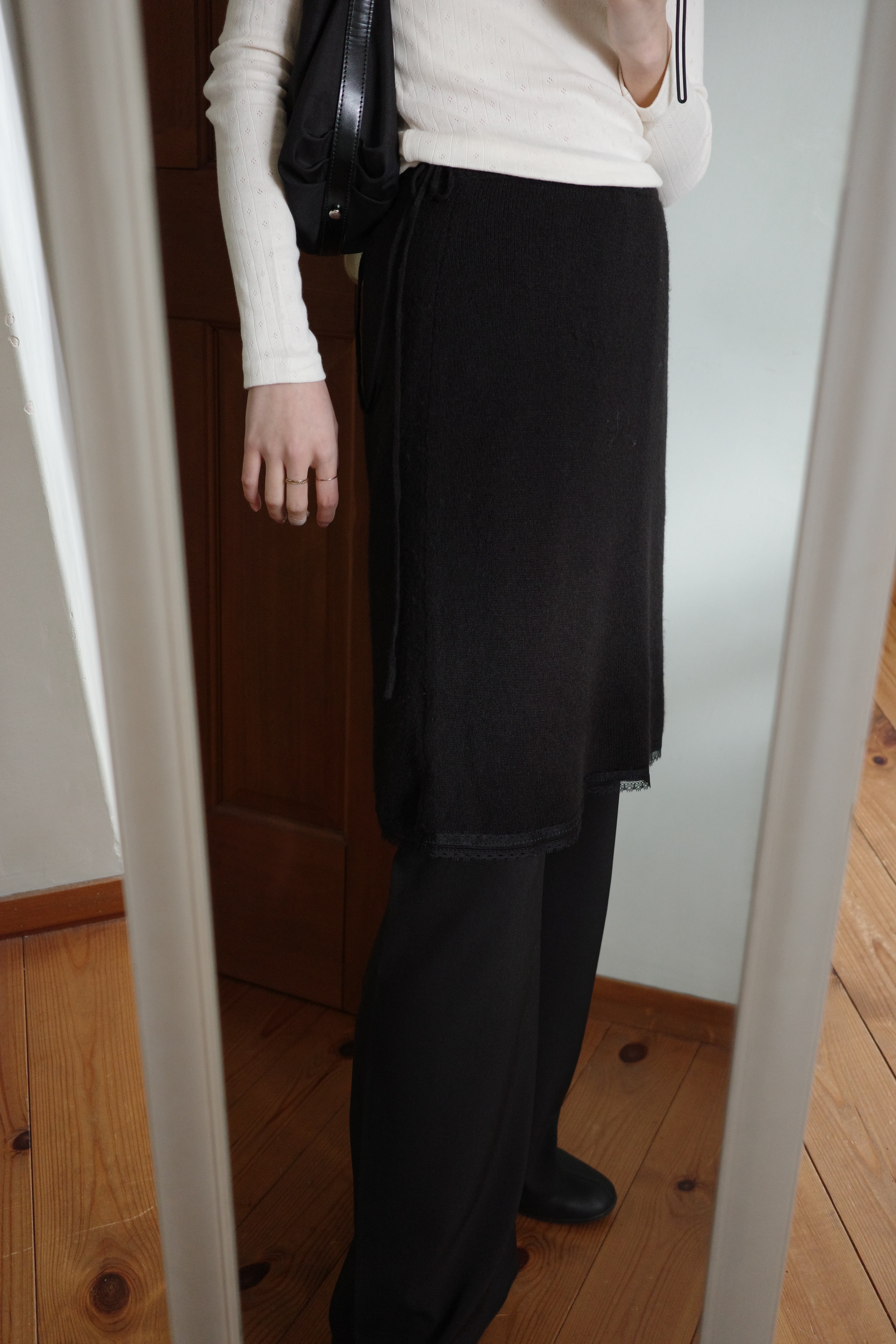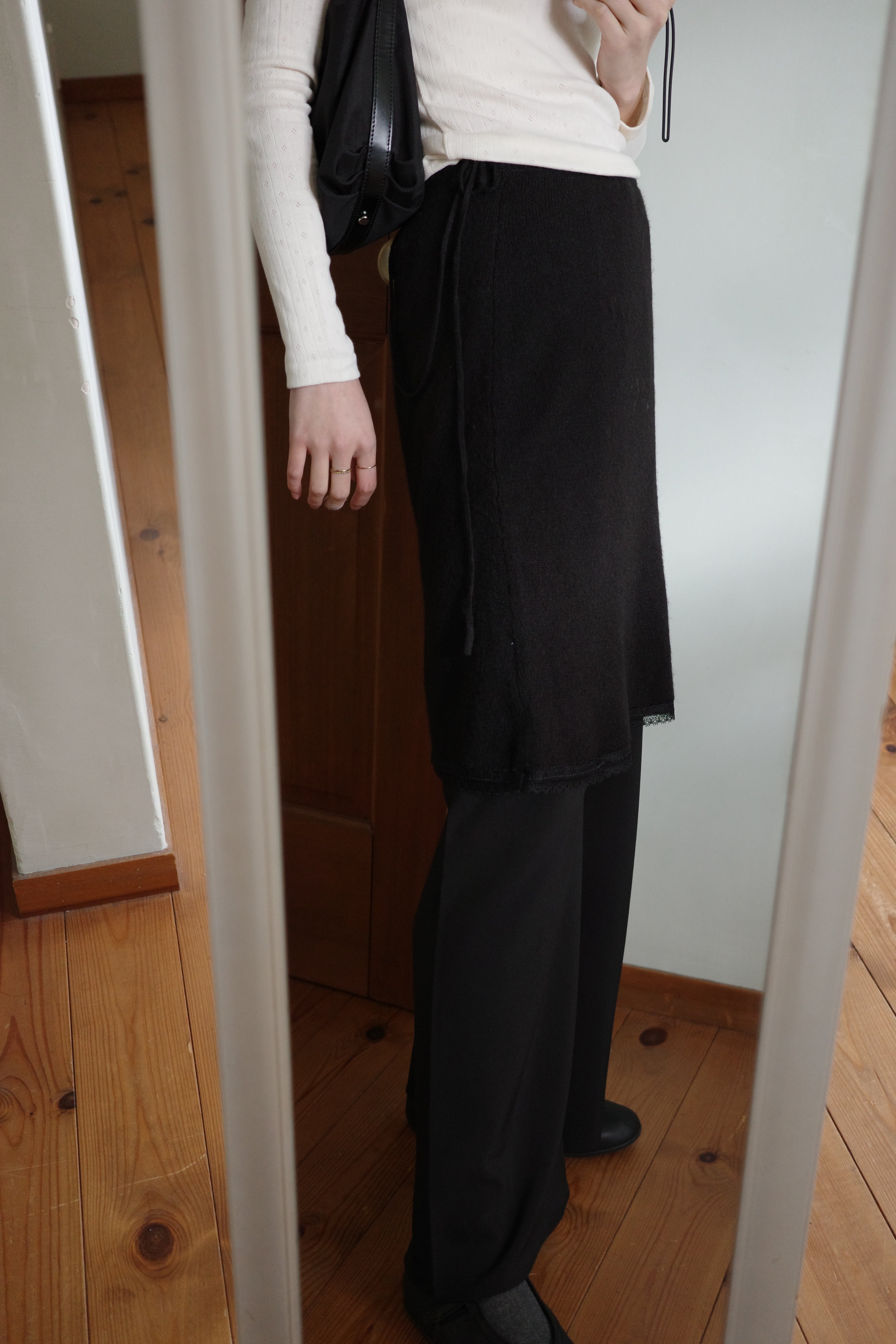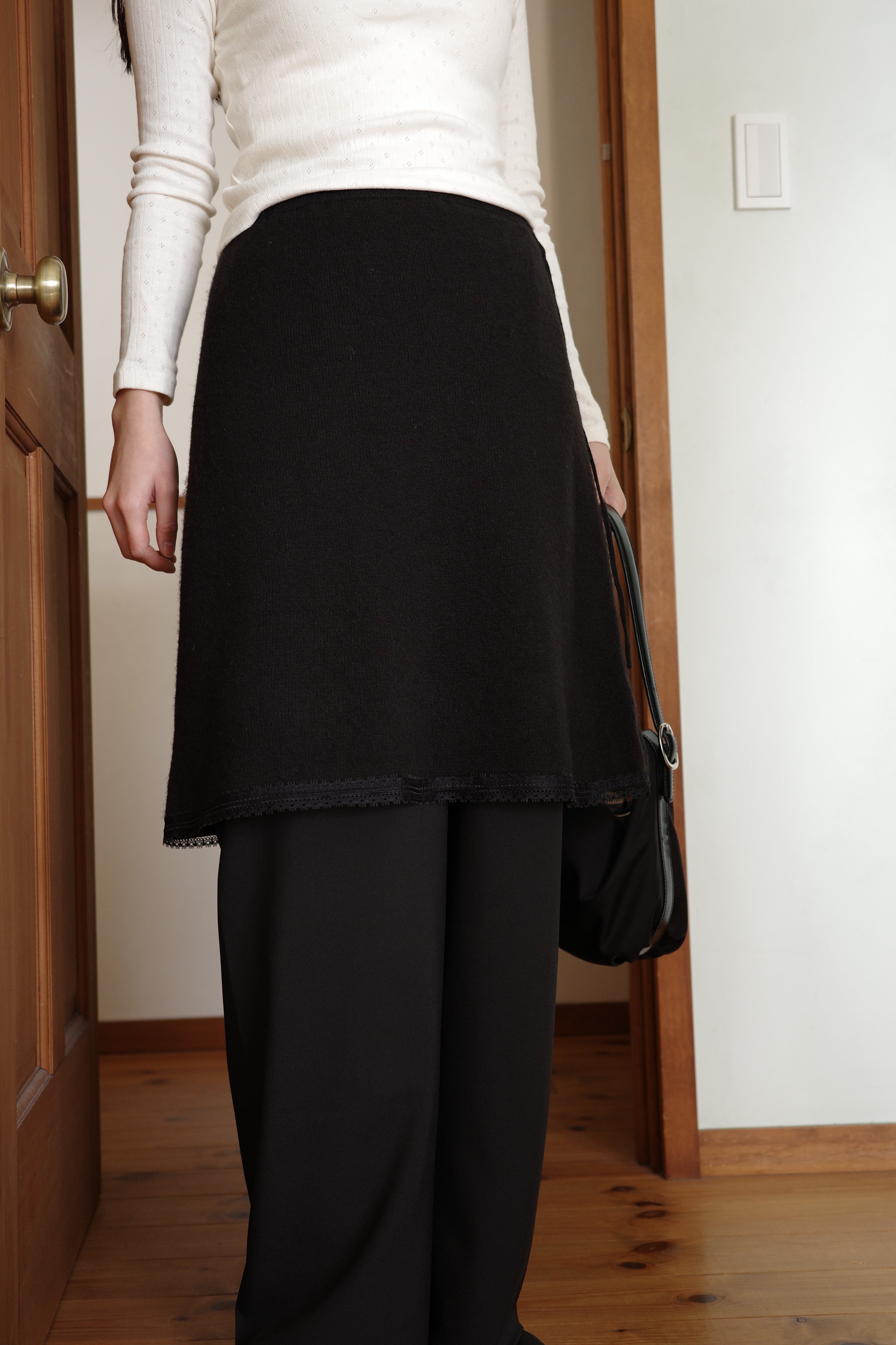 クラシックでロマンチックなムードを演出する膝丈のニットスカート。裾のレースが上品なアクセントとなり、女性らしさを引き立てます。
