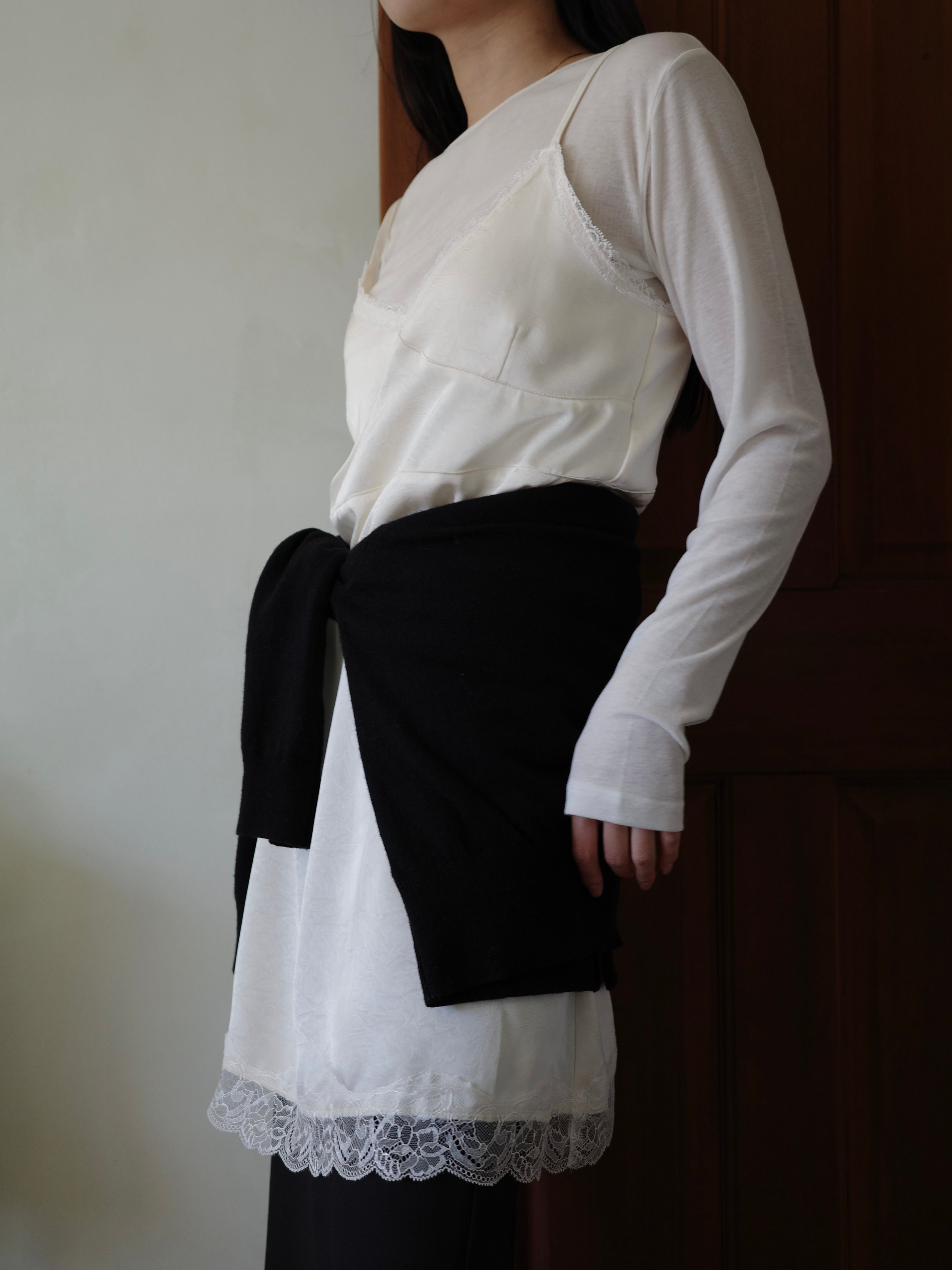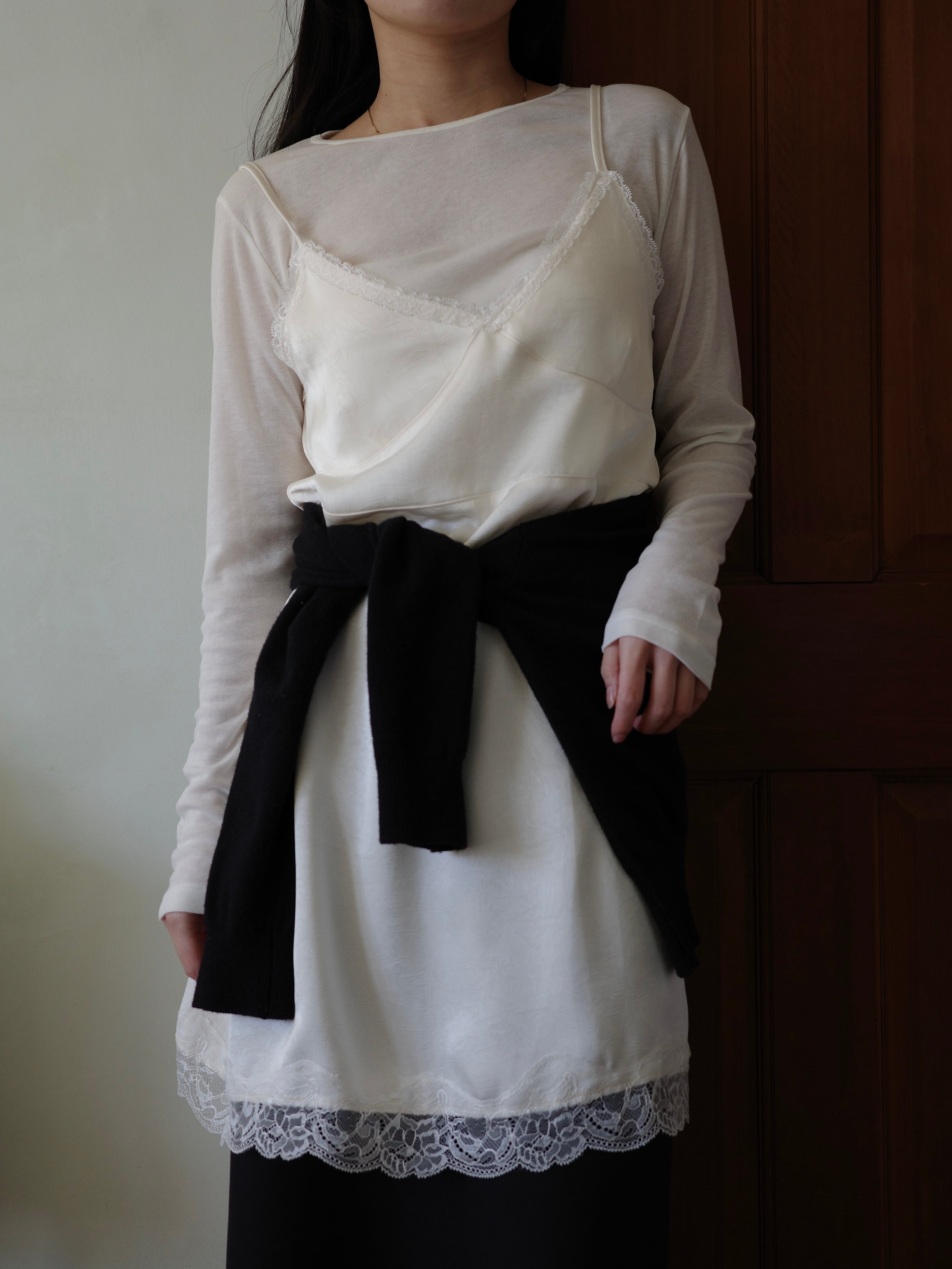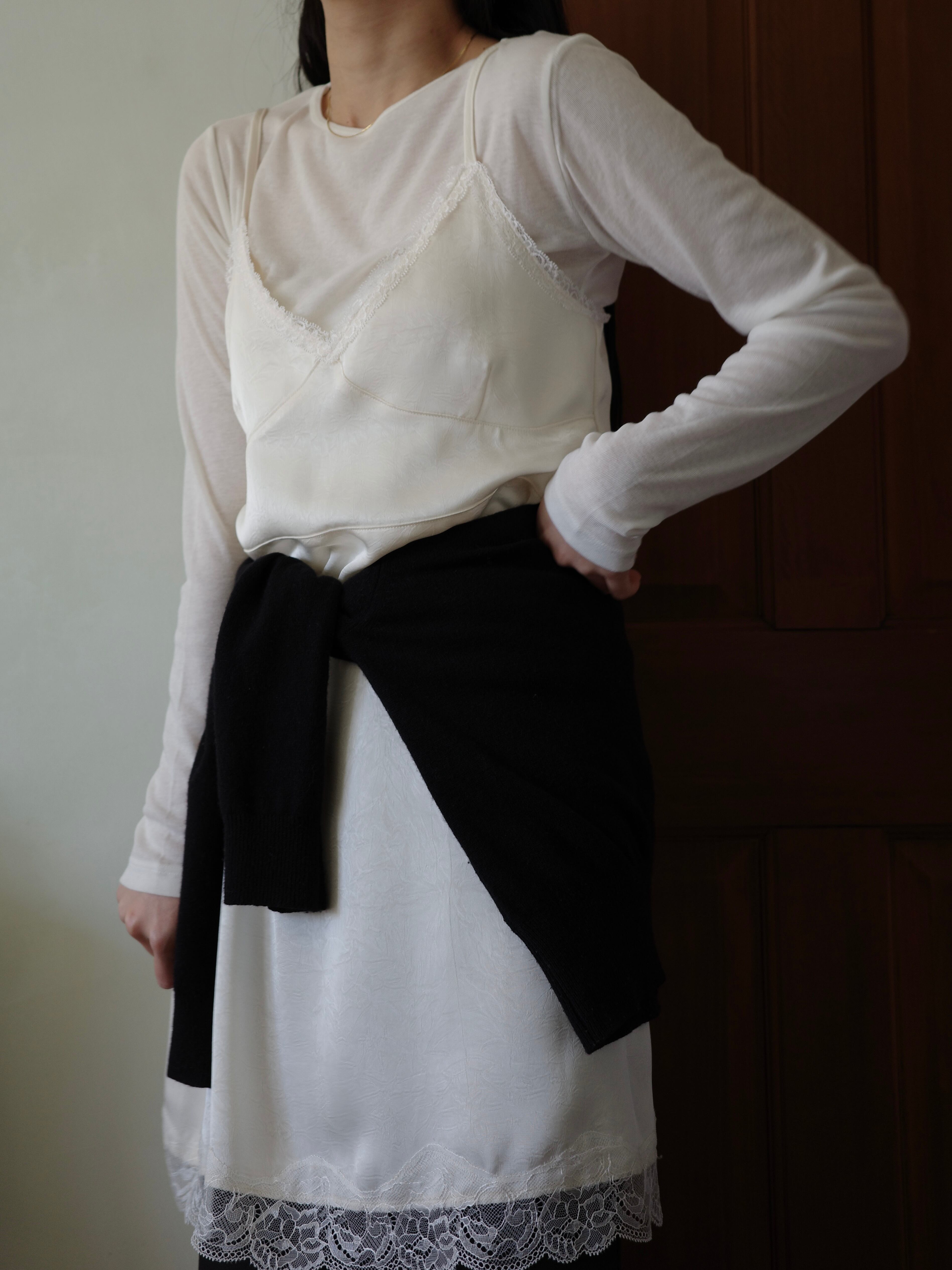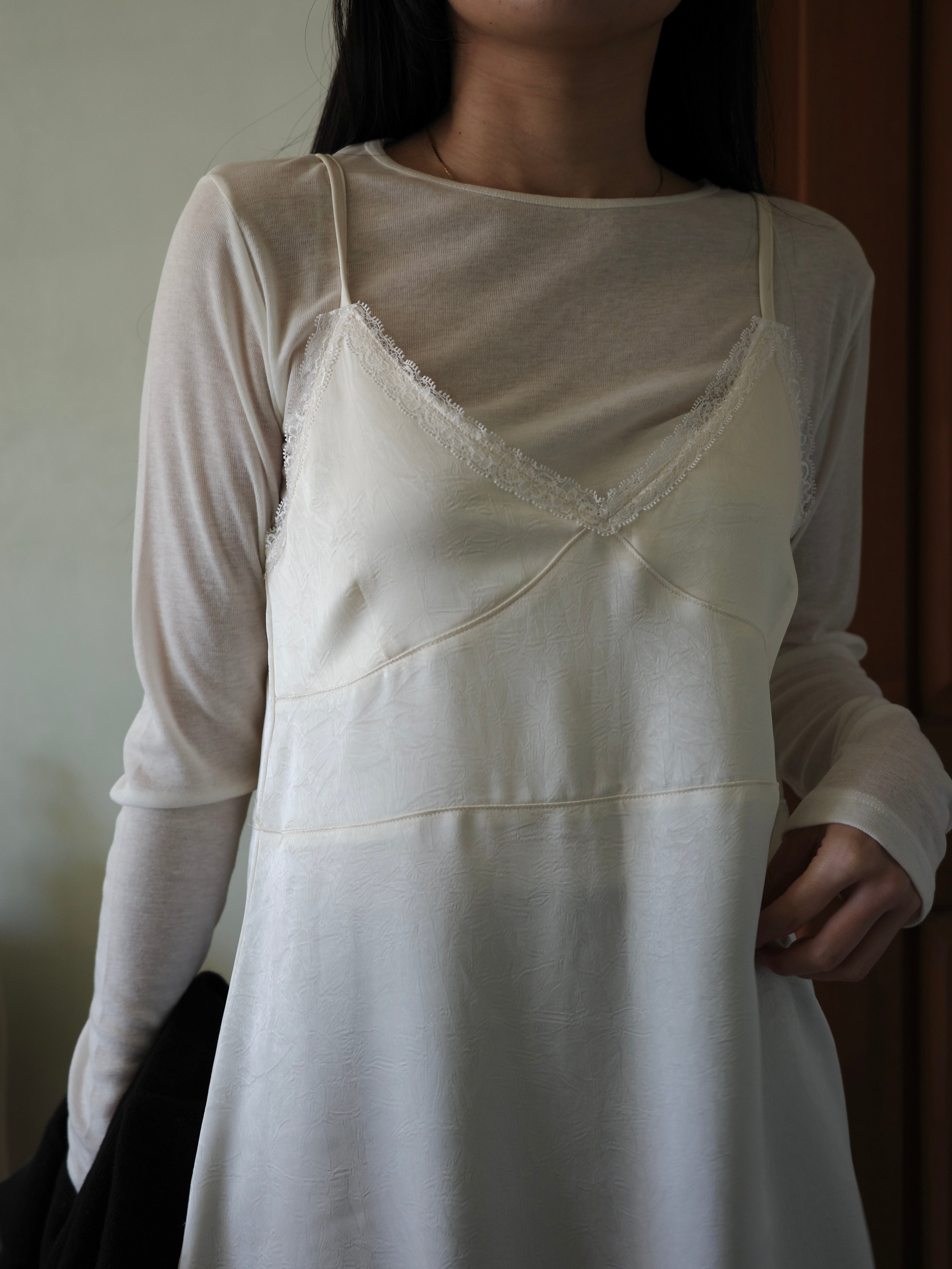 程よい艶感のあるサテン調のエンボス生地に、繊細なレースをあしらったキャミワンピース。