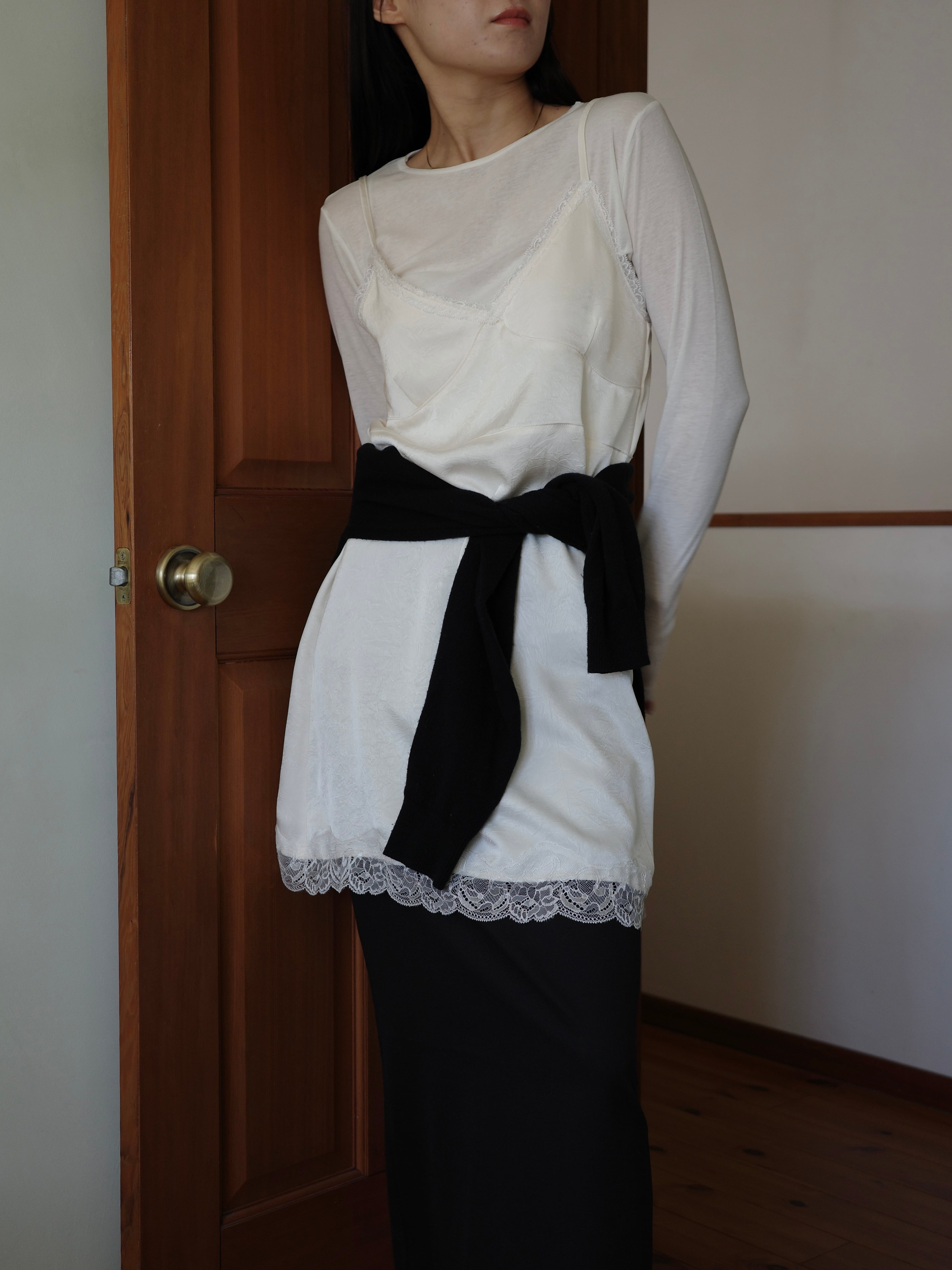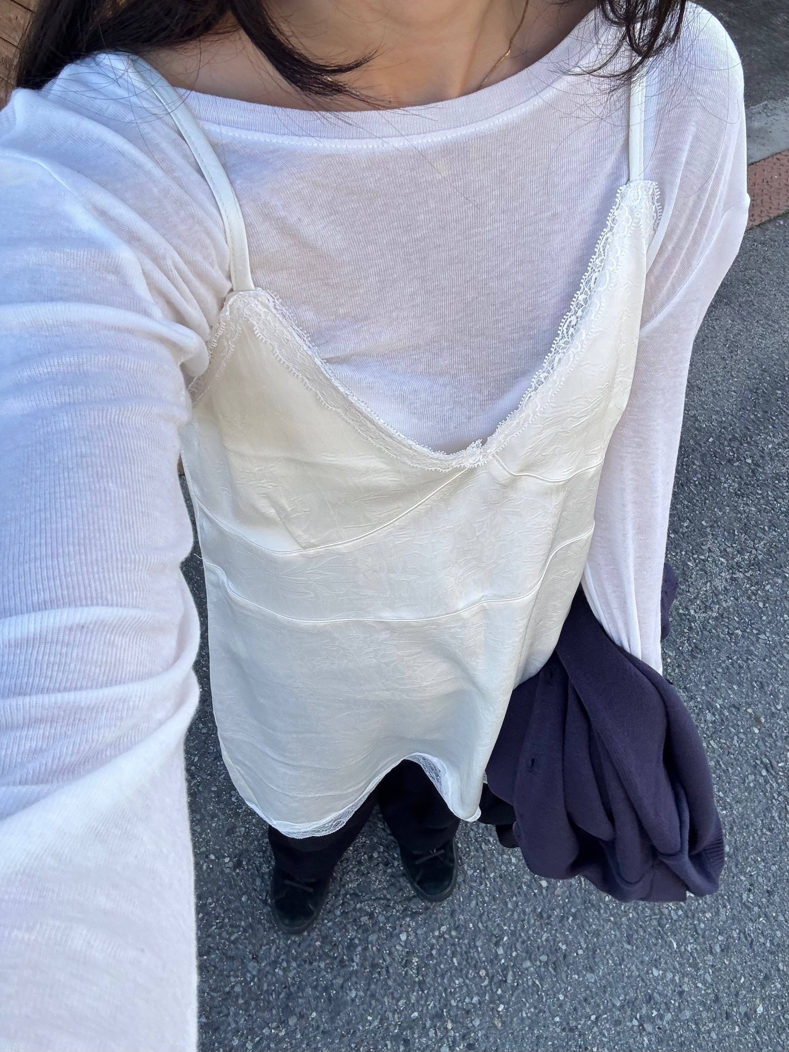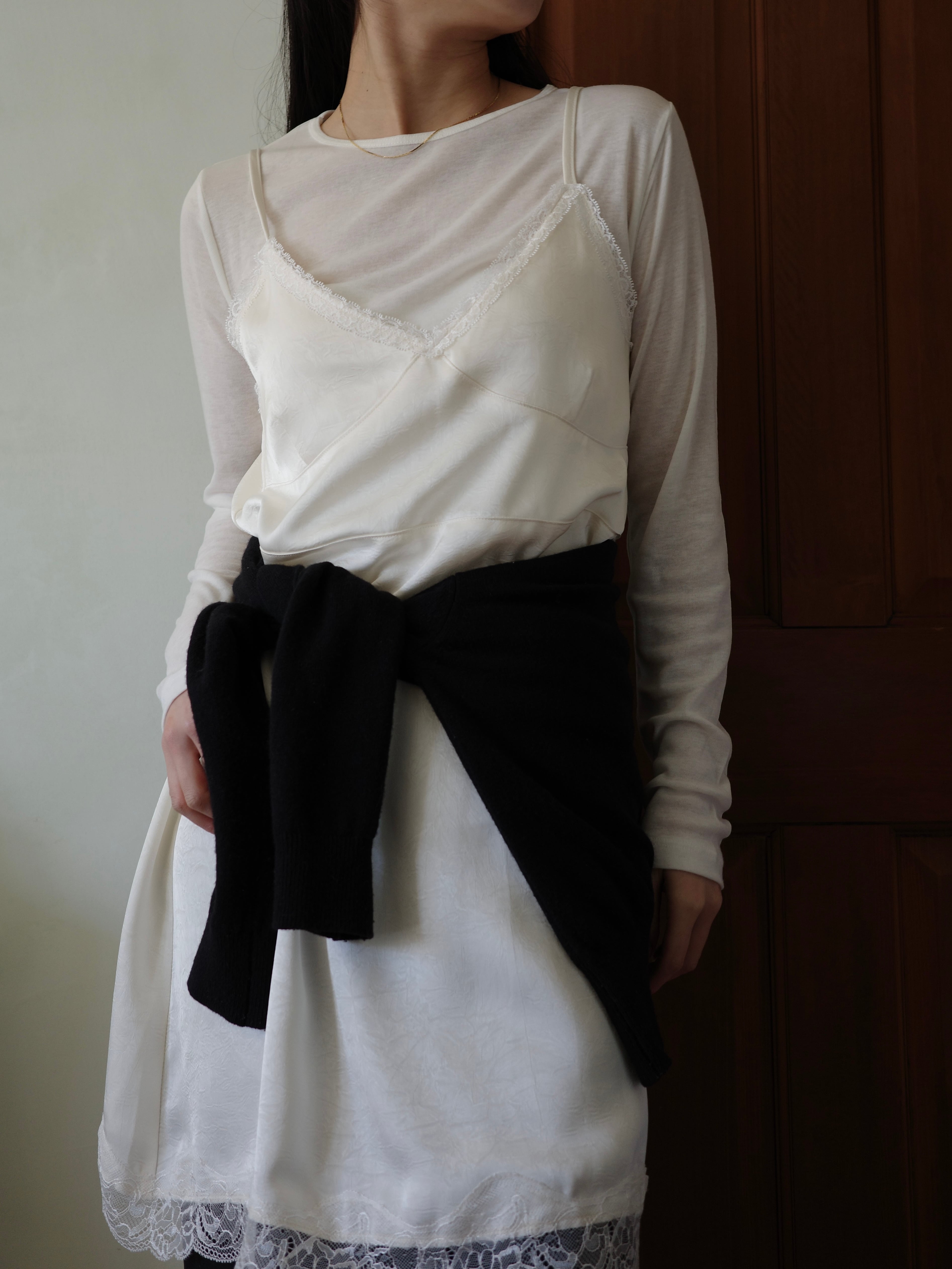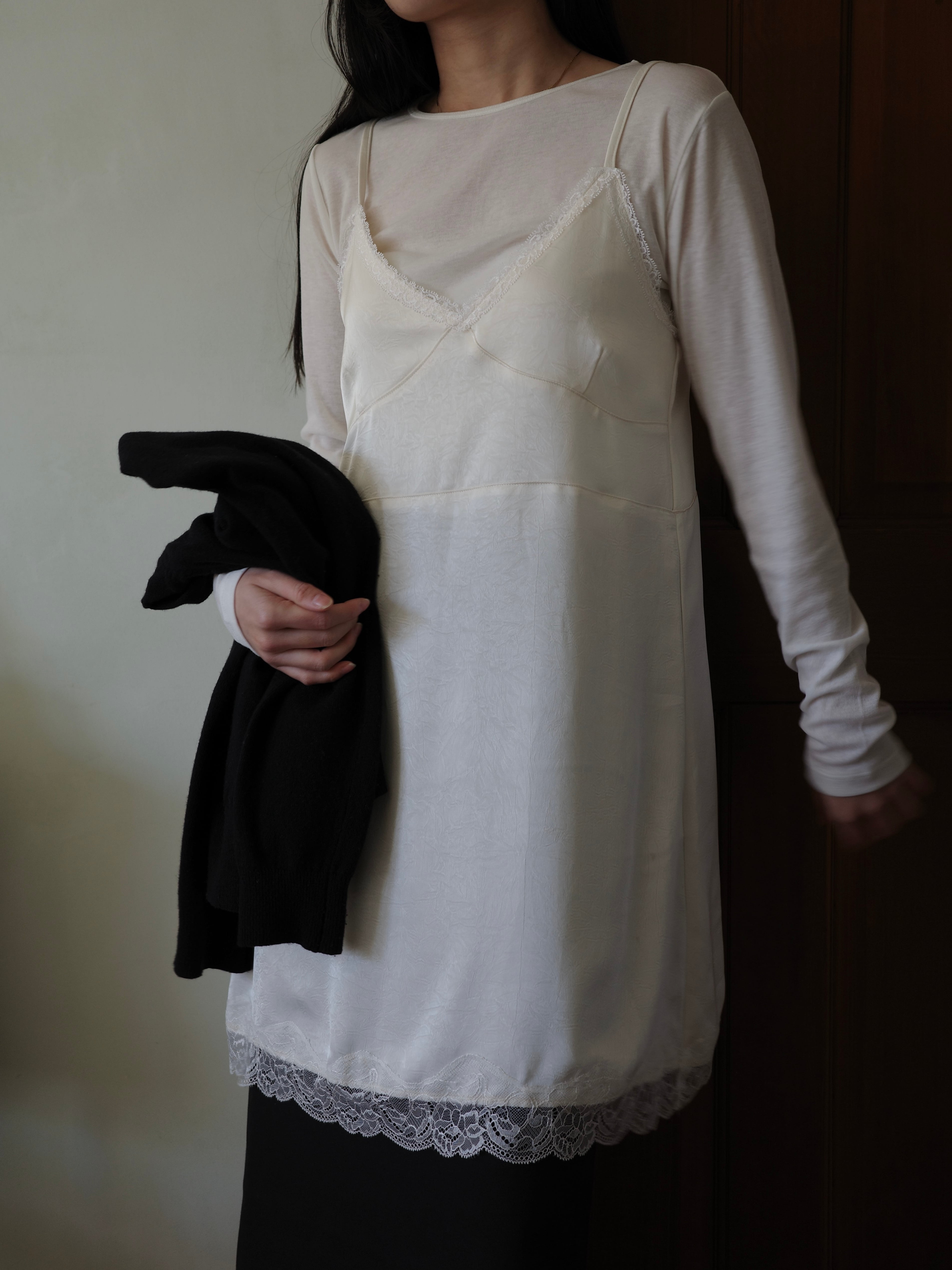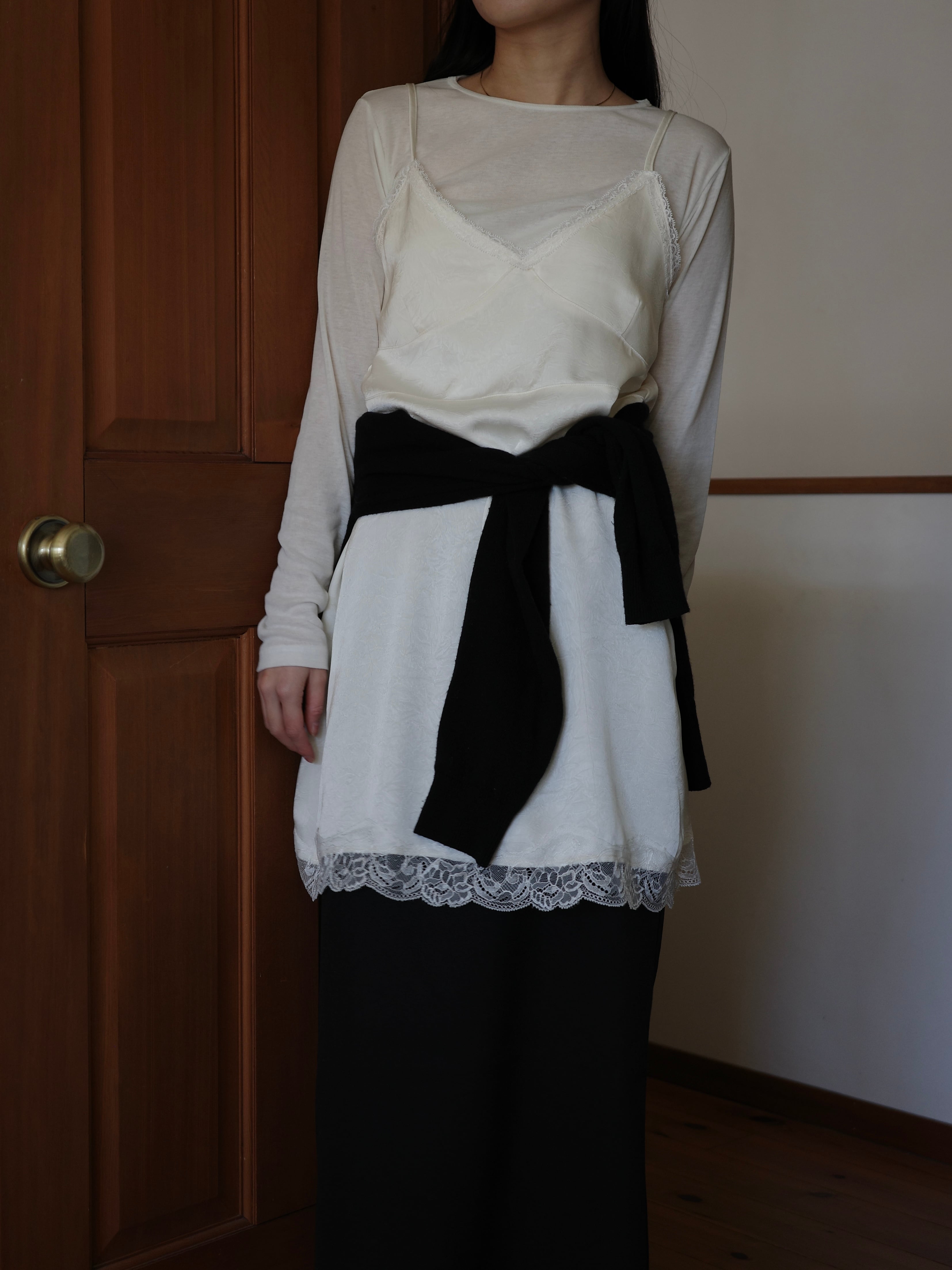 程よい艶感のあるサテン調のエンボス生地に、繊細なレースをあしらったキャミワンピース。