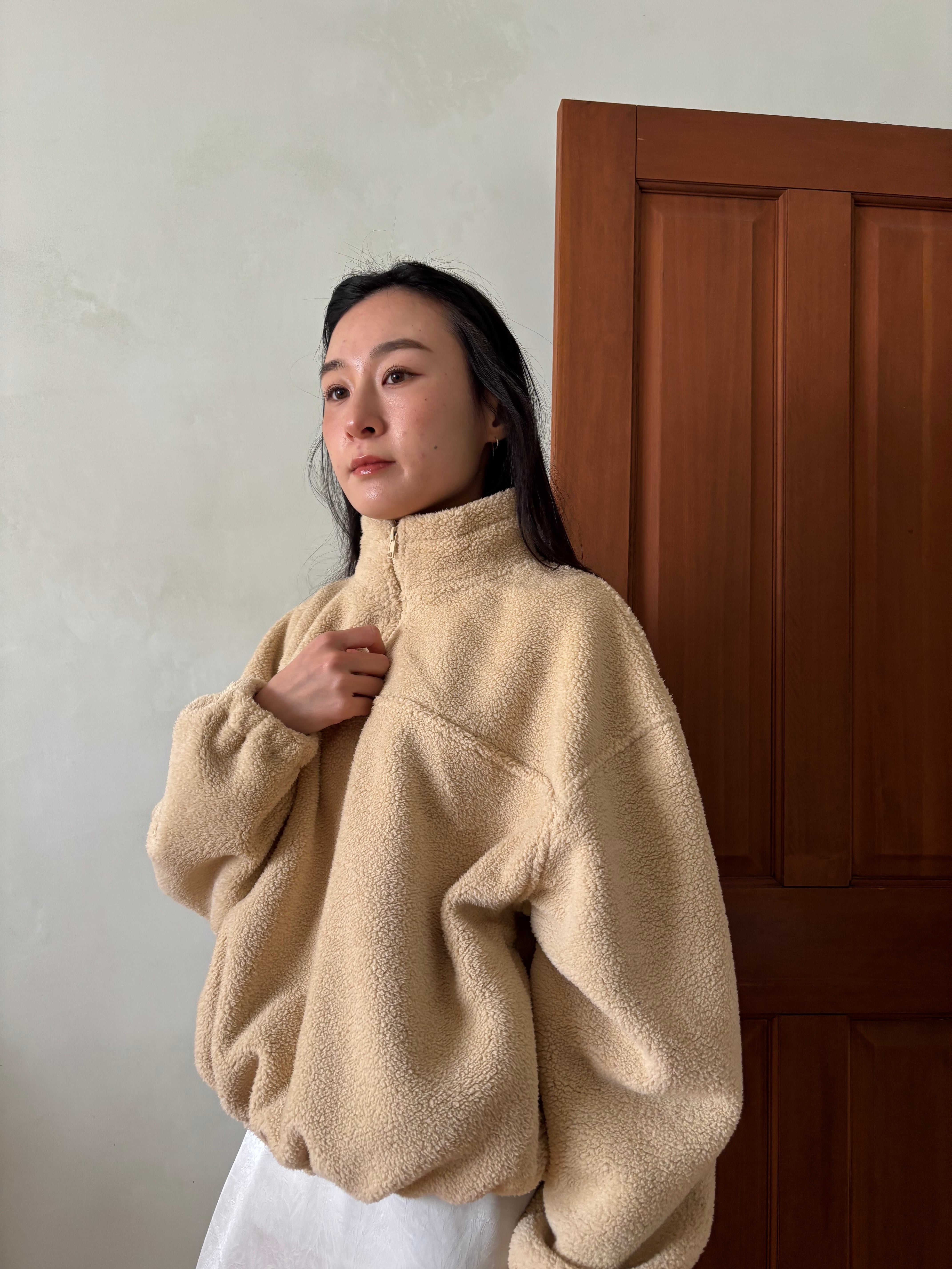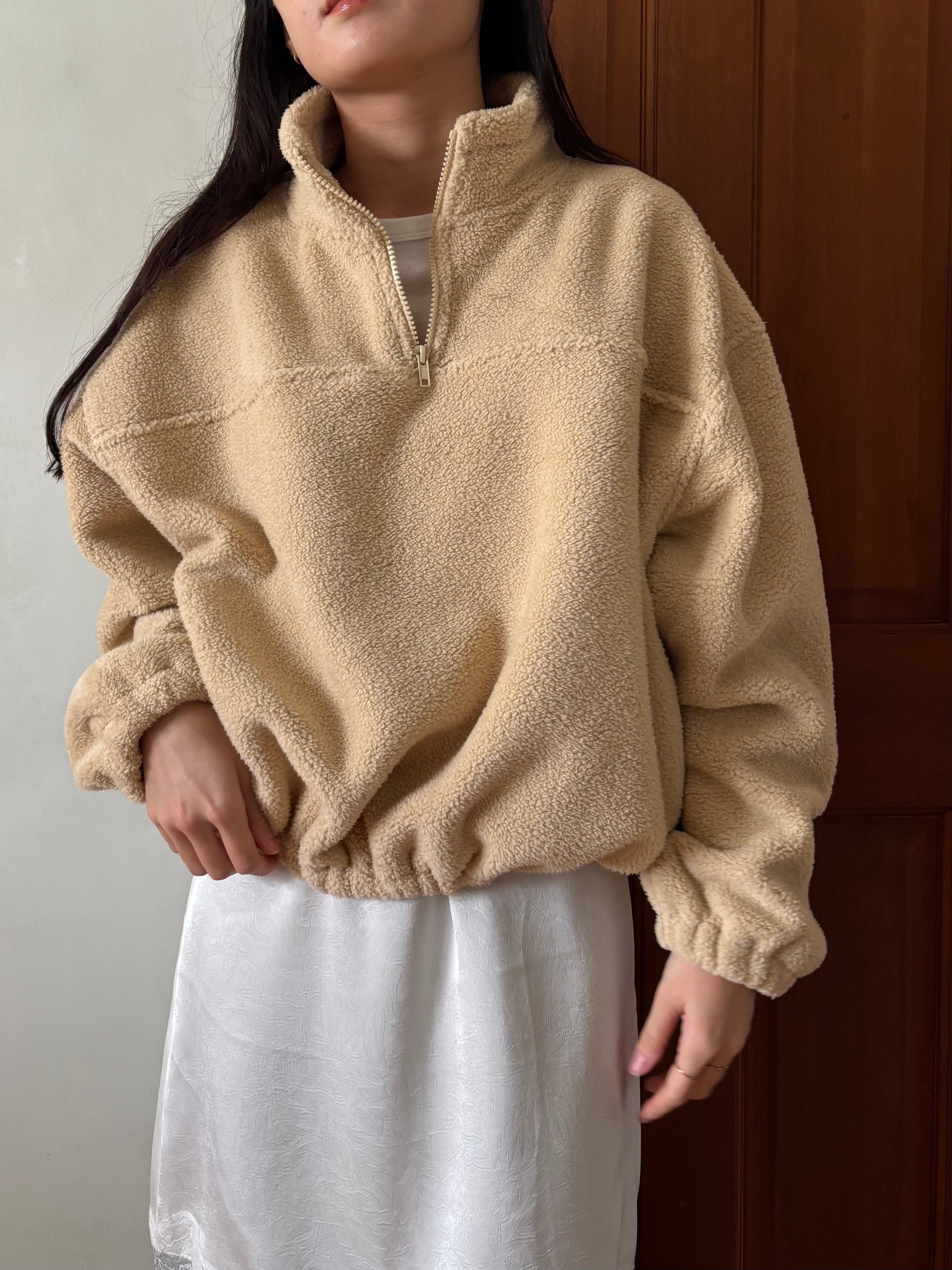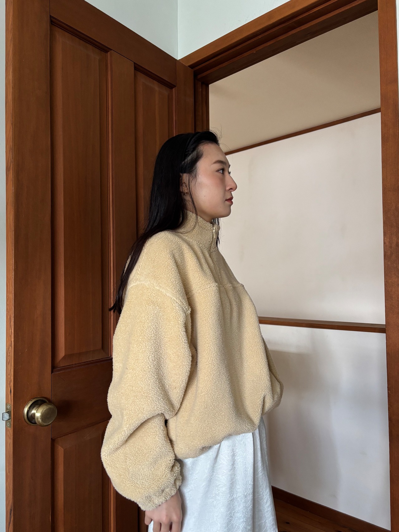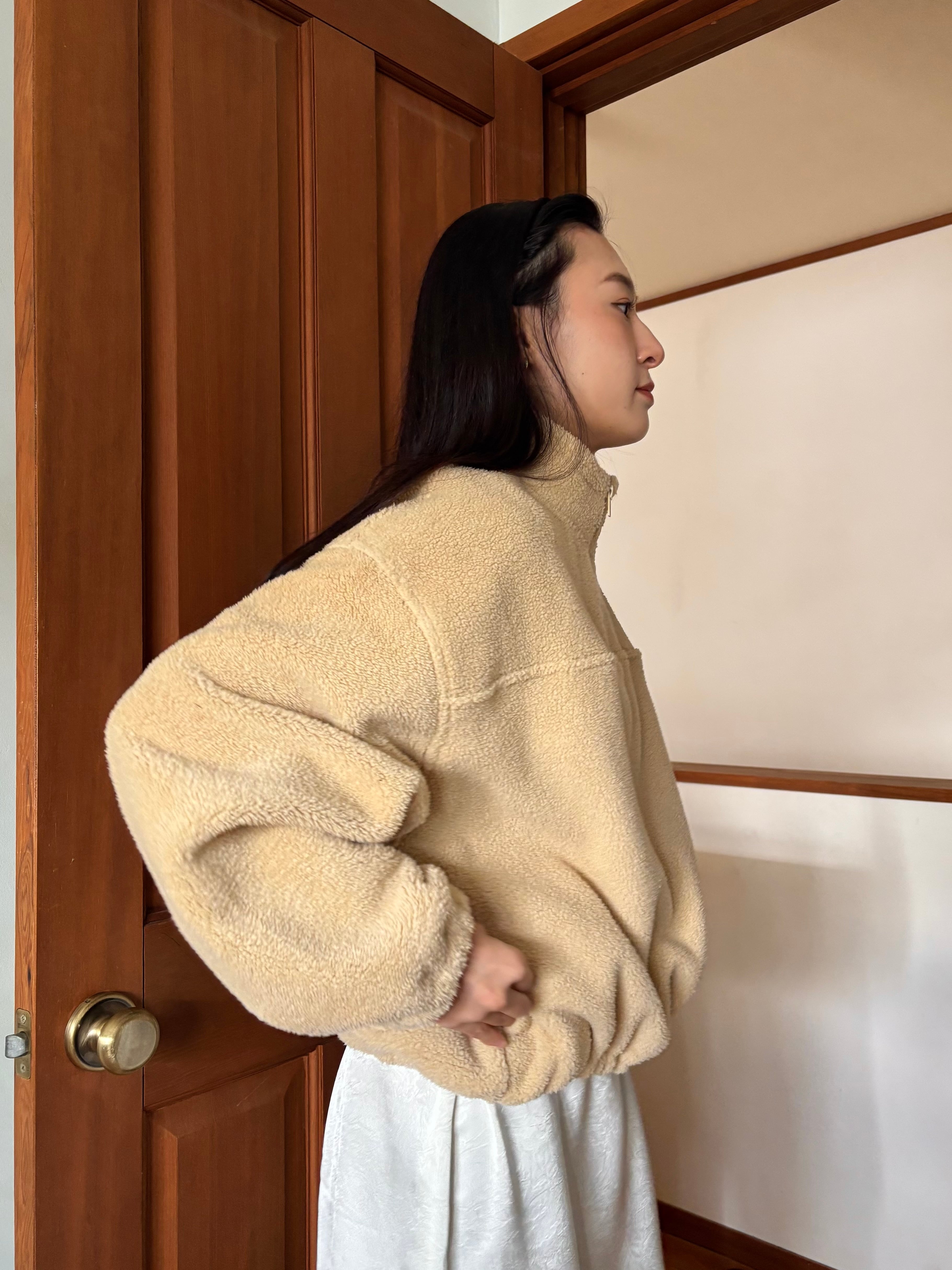 もこもこの質感が可愛いテディフリースのハーフジップトップス。