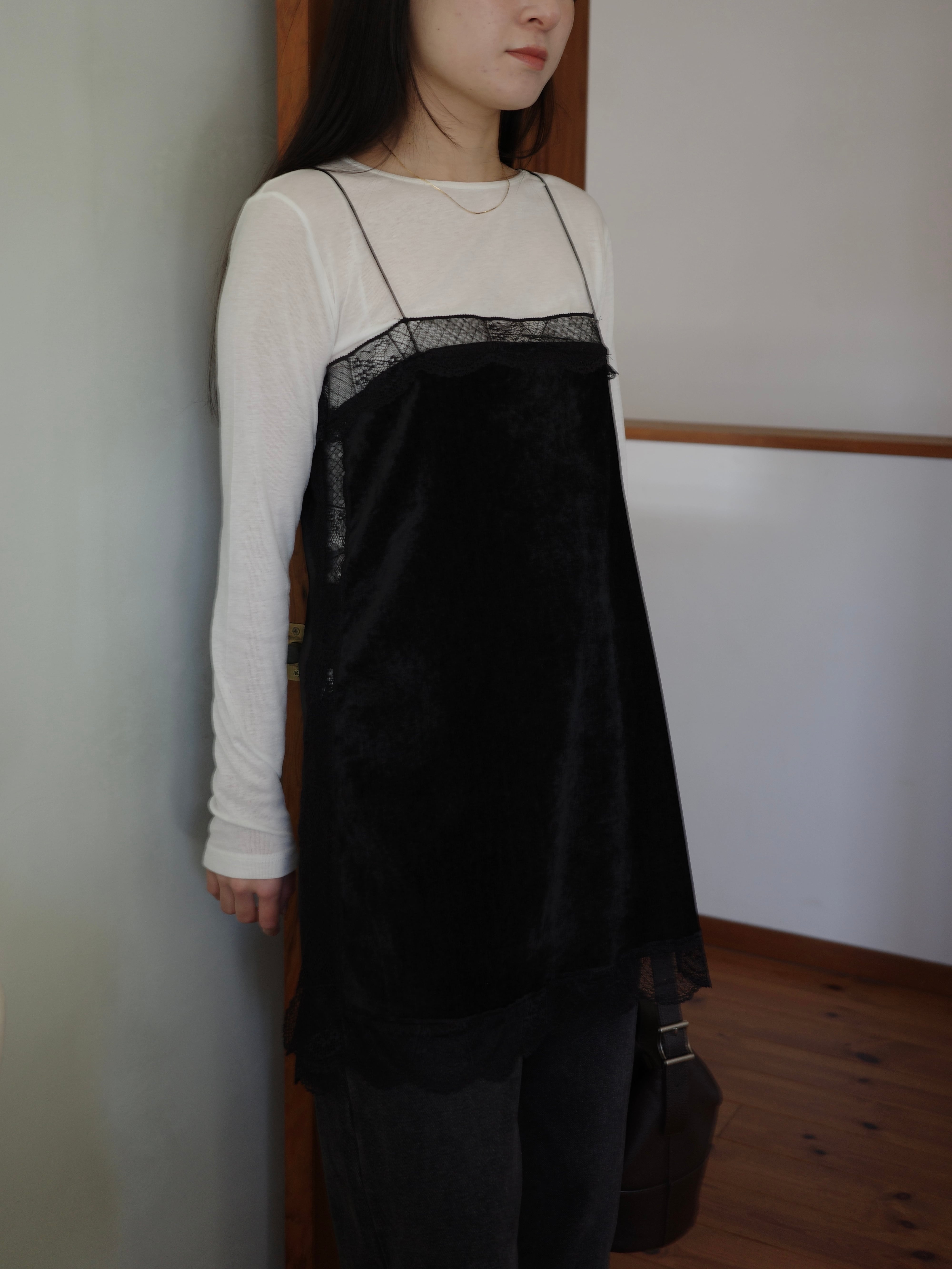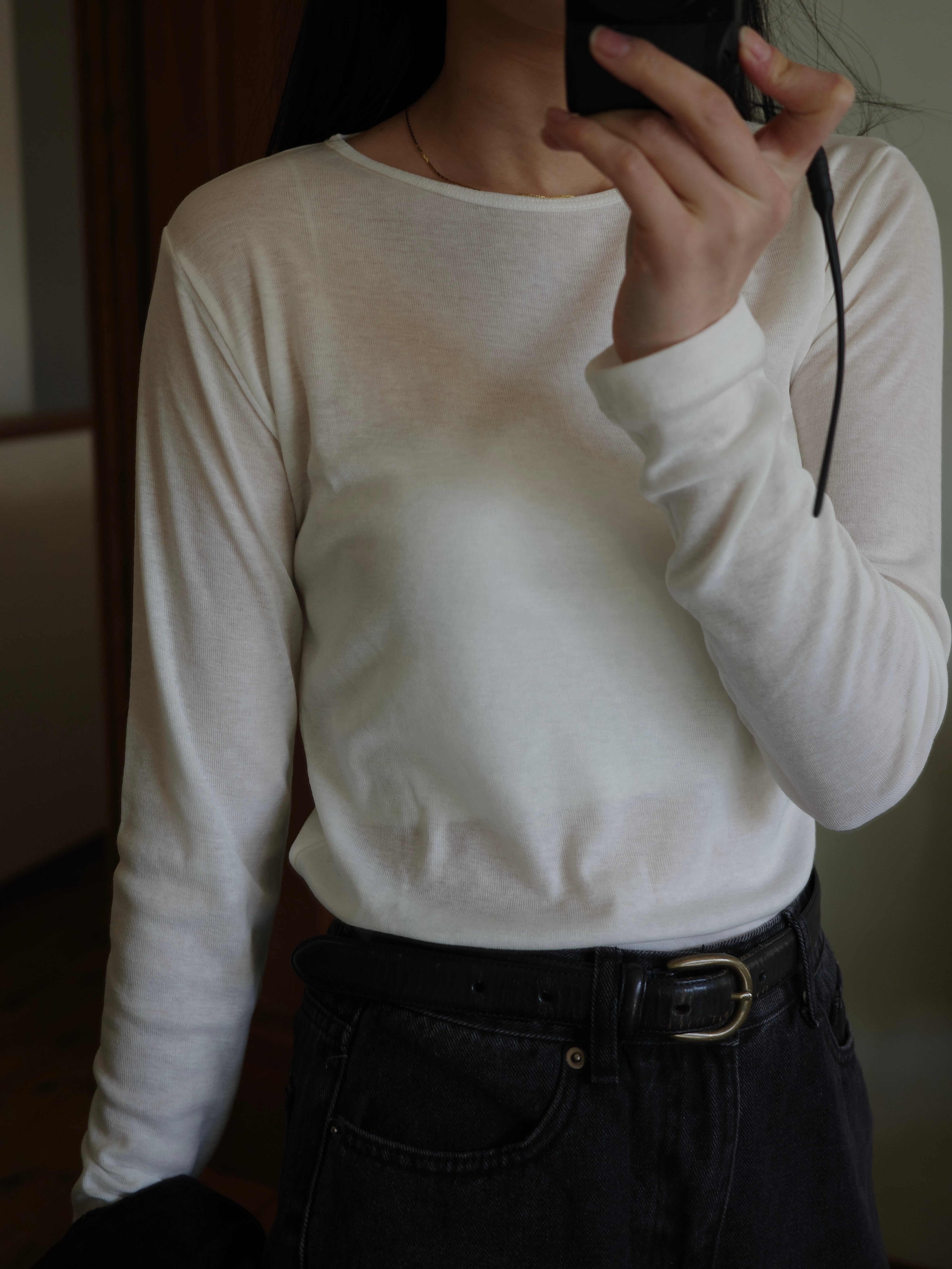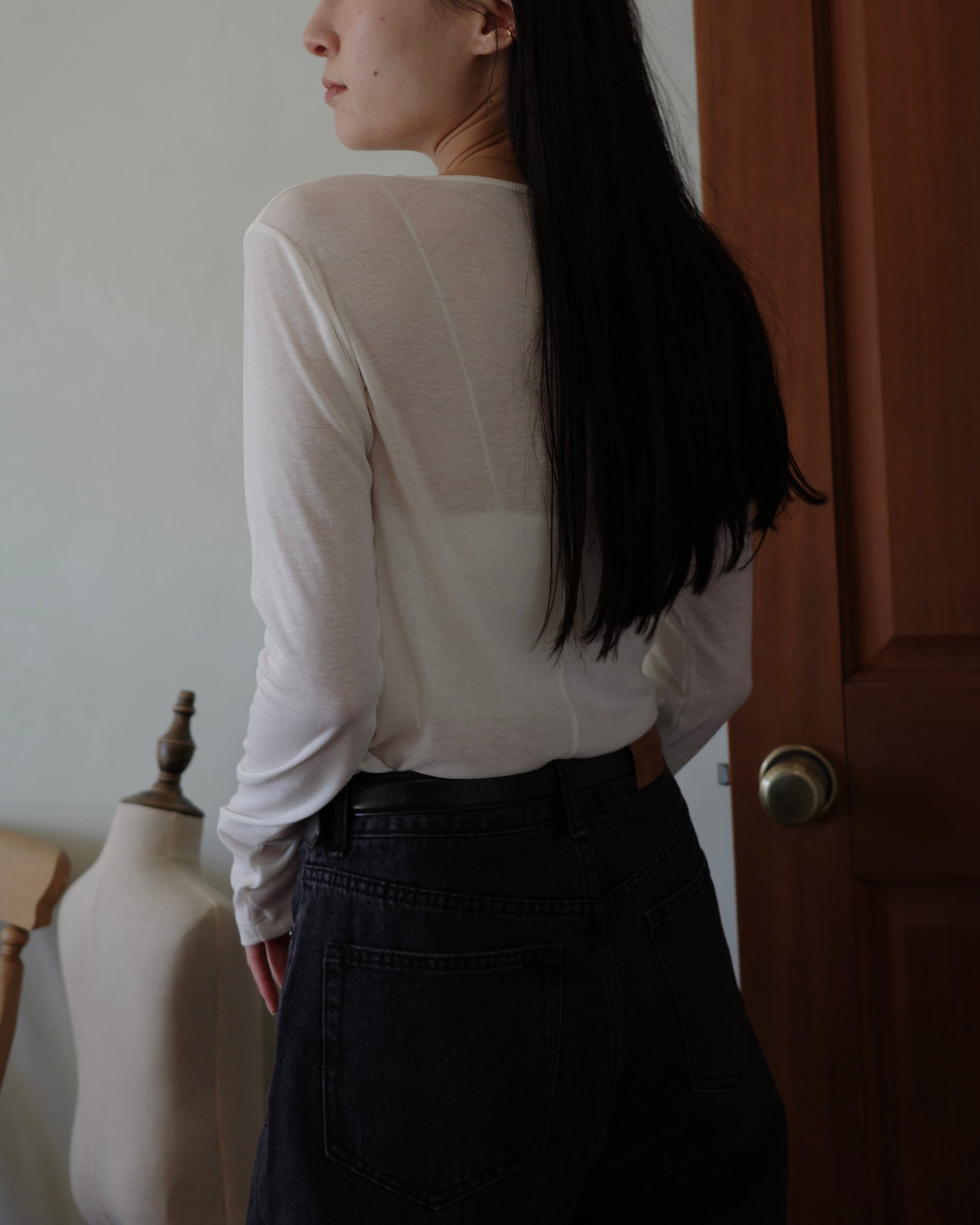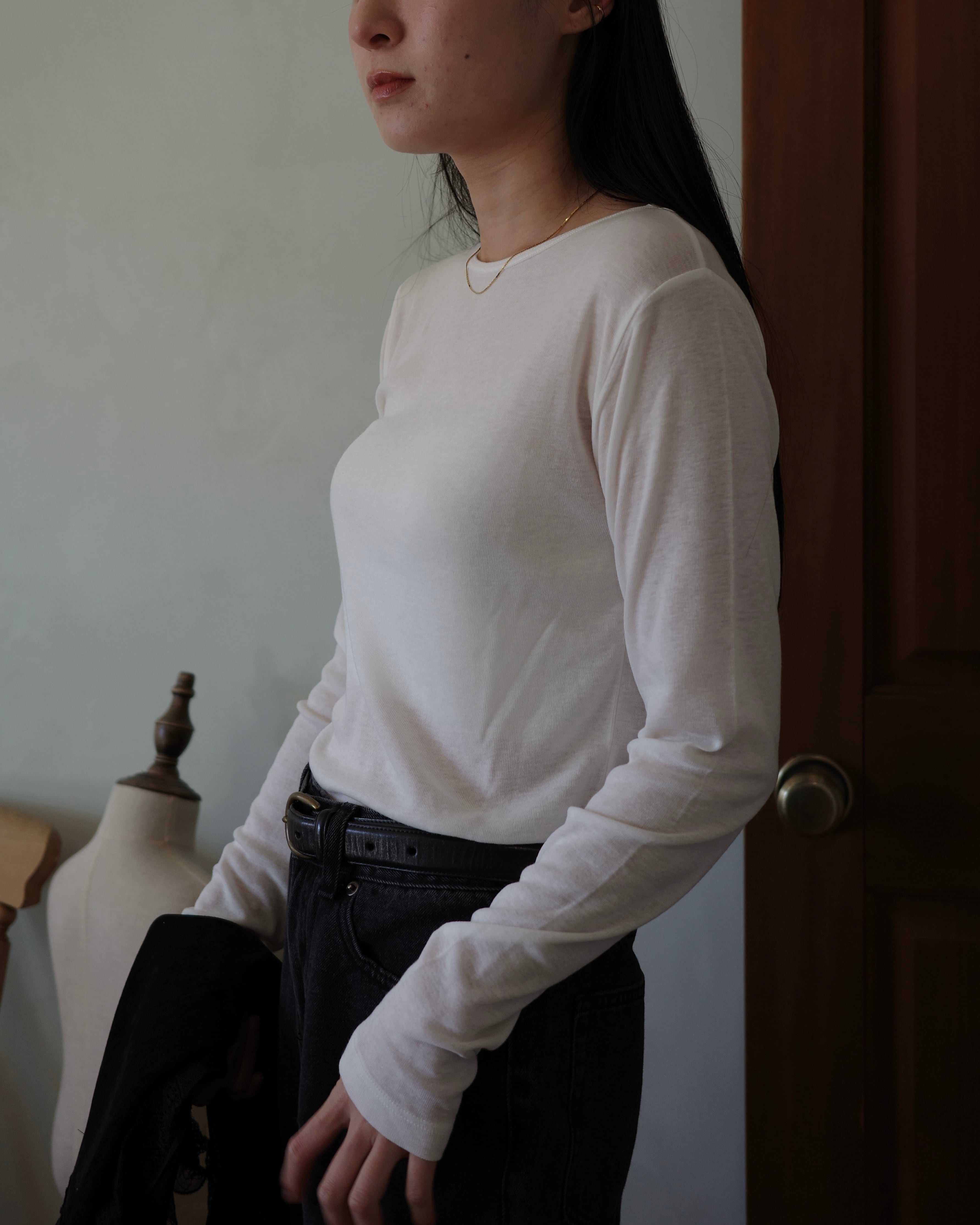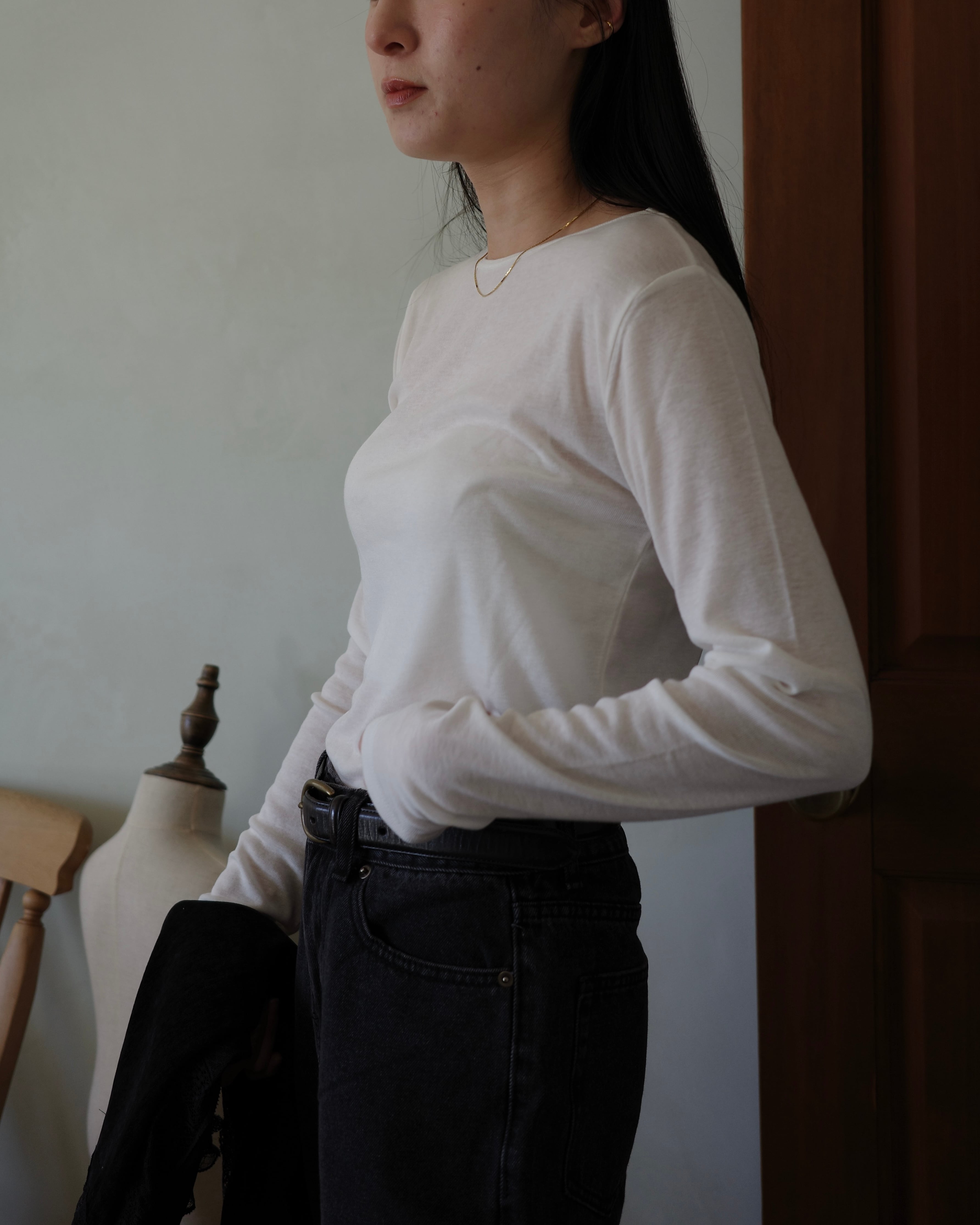ニットやカーディガンの下に、レイヤードスタイルに万能に使えて、ベーシックなTシャツより抜け感がでておすすめです。