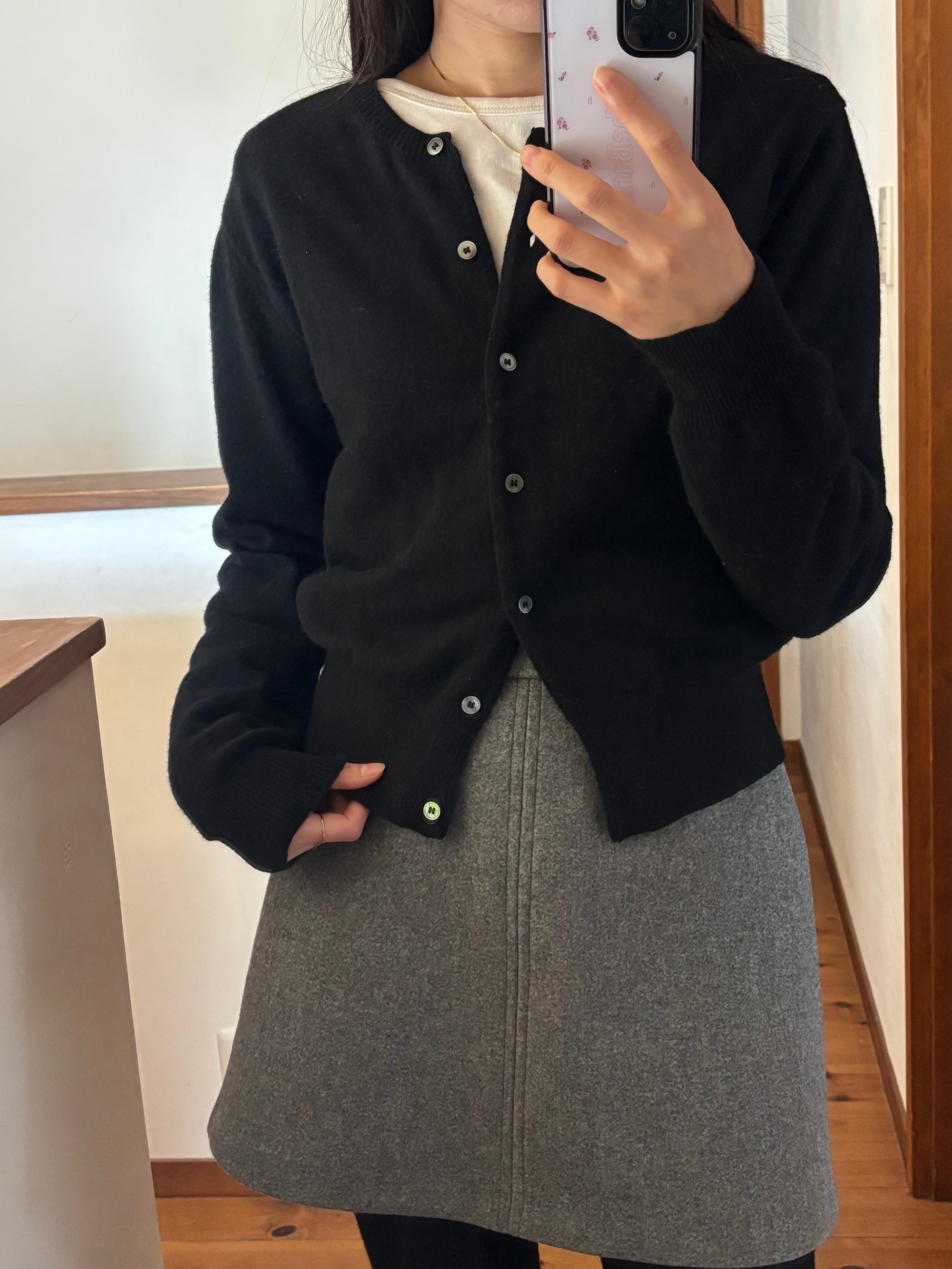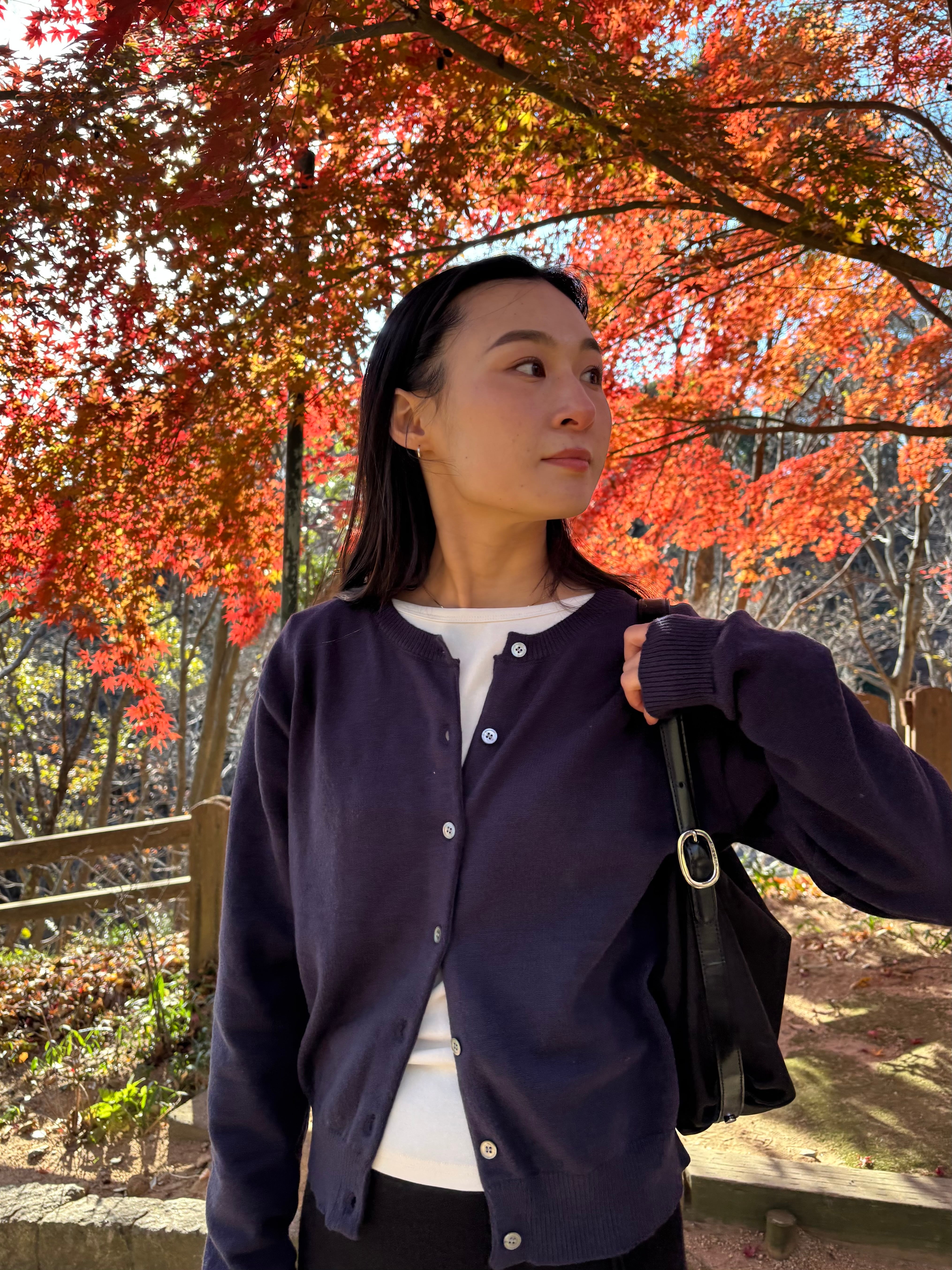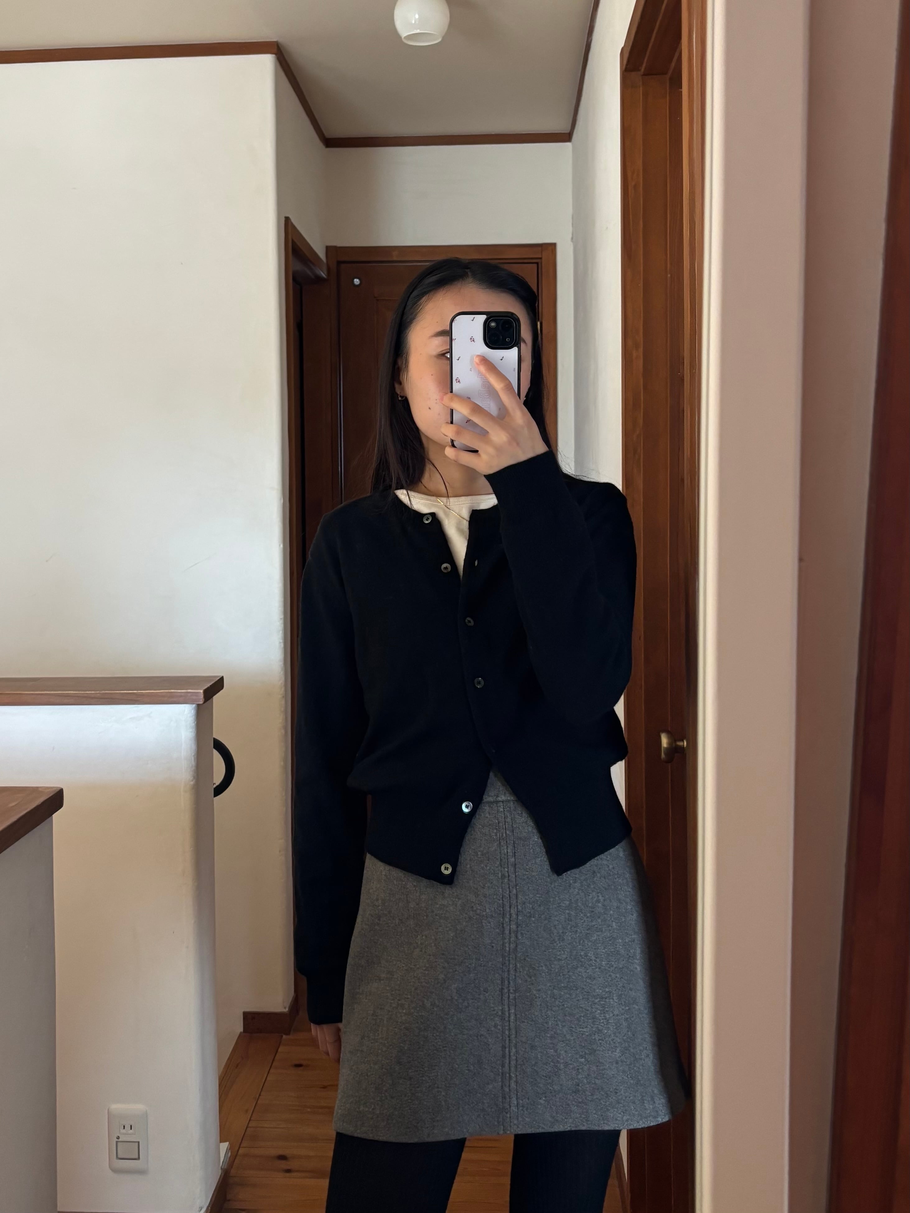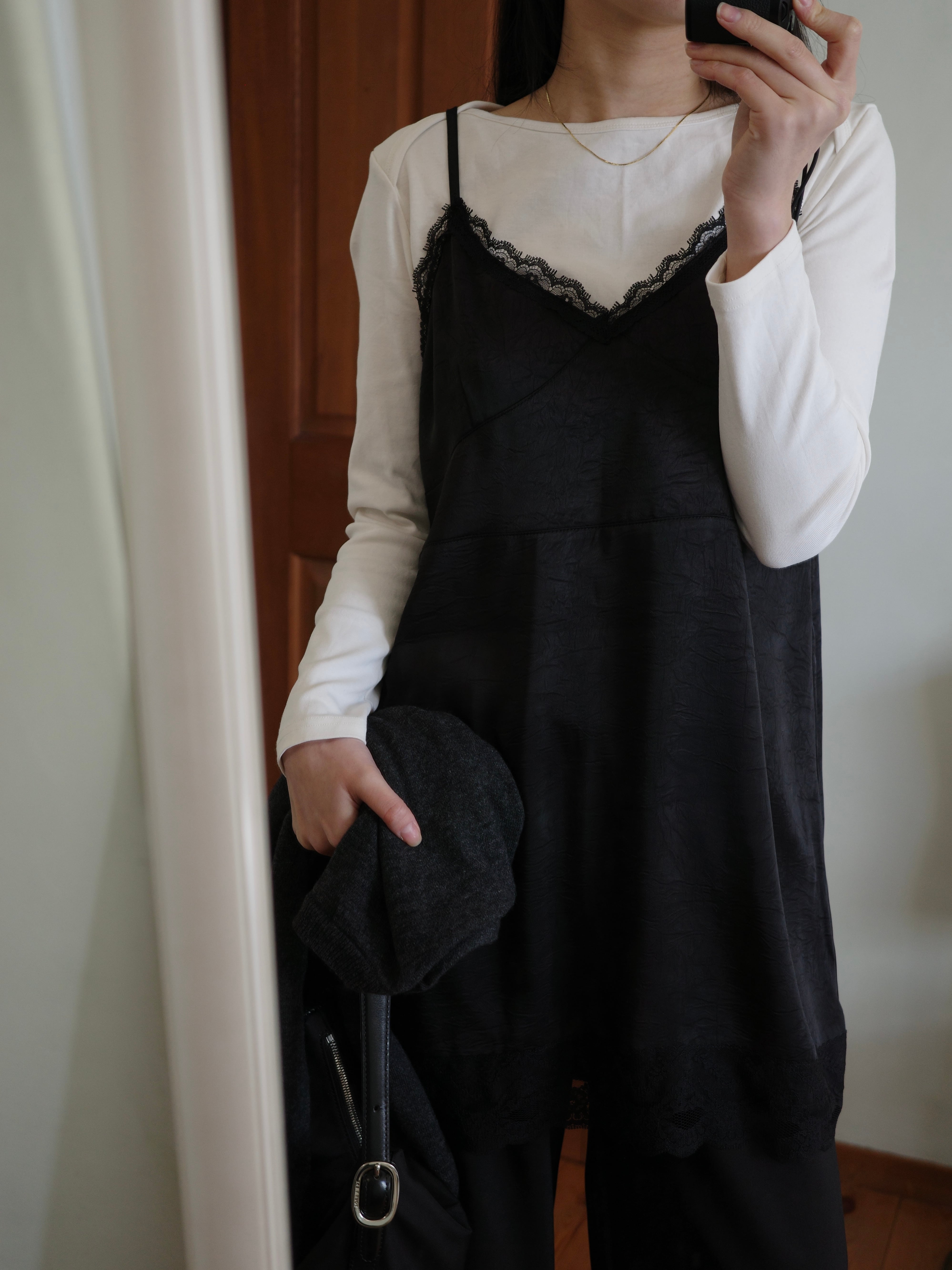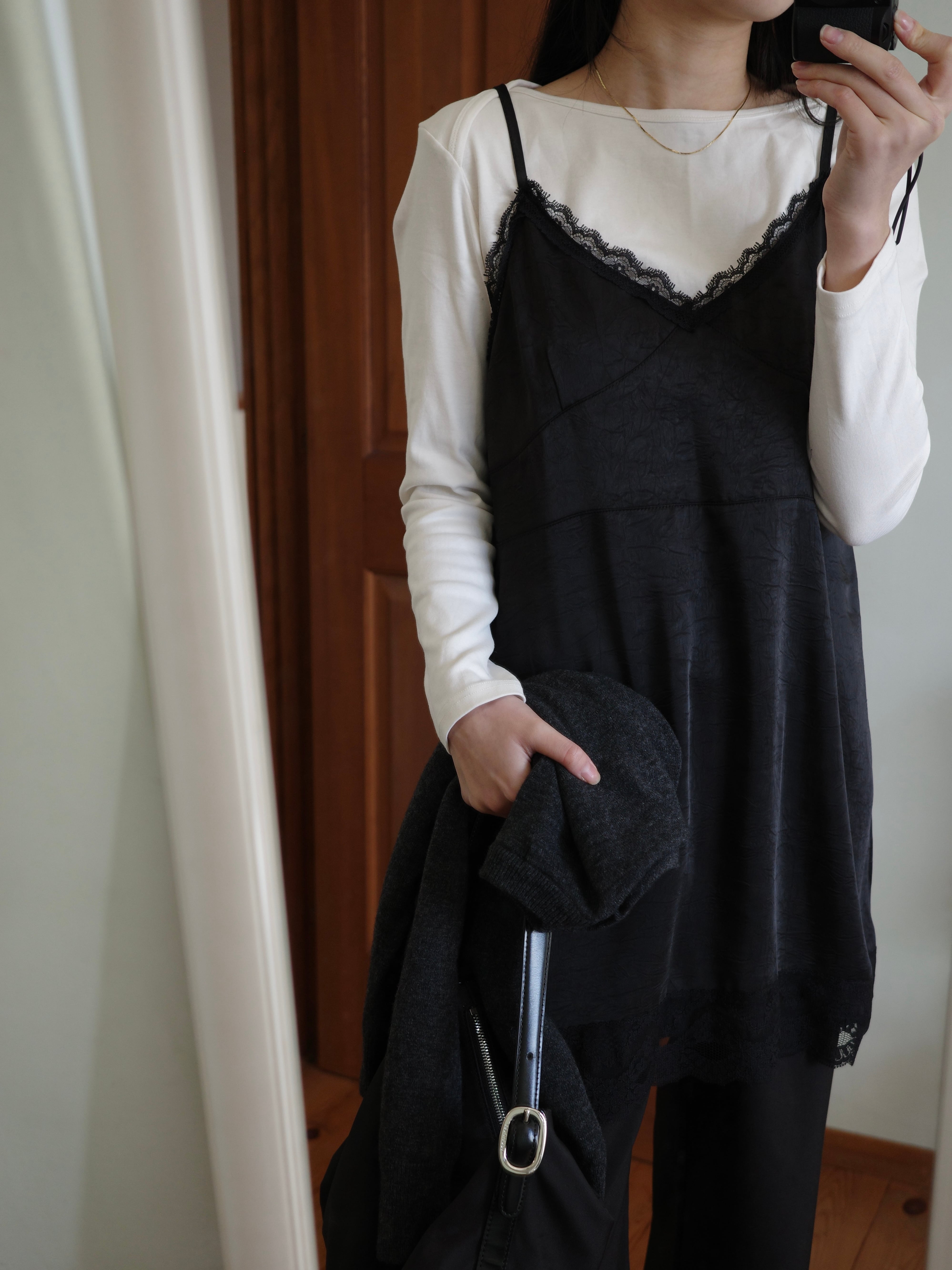 襟元はラップショルダー風の重ねデザインで、シンプルながらも表情のある仕上がりに。