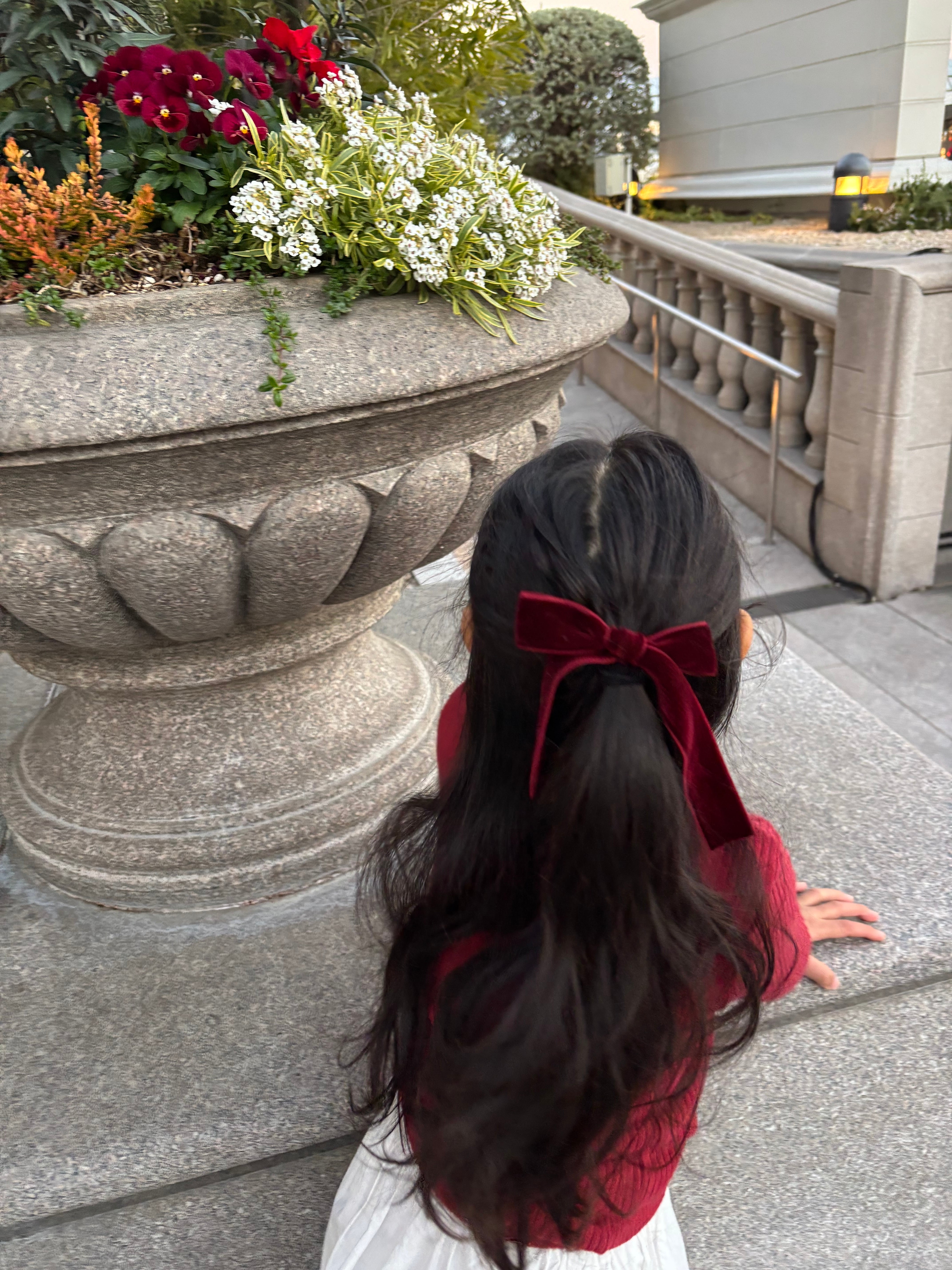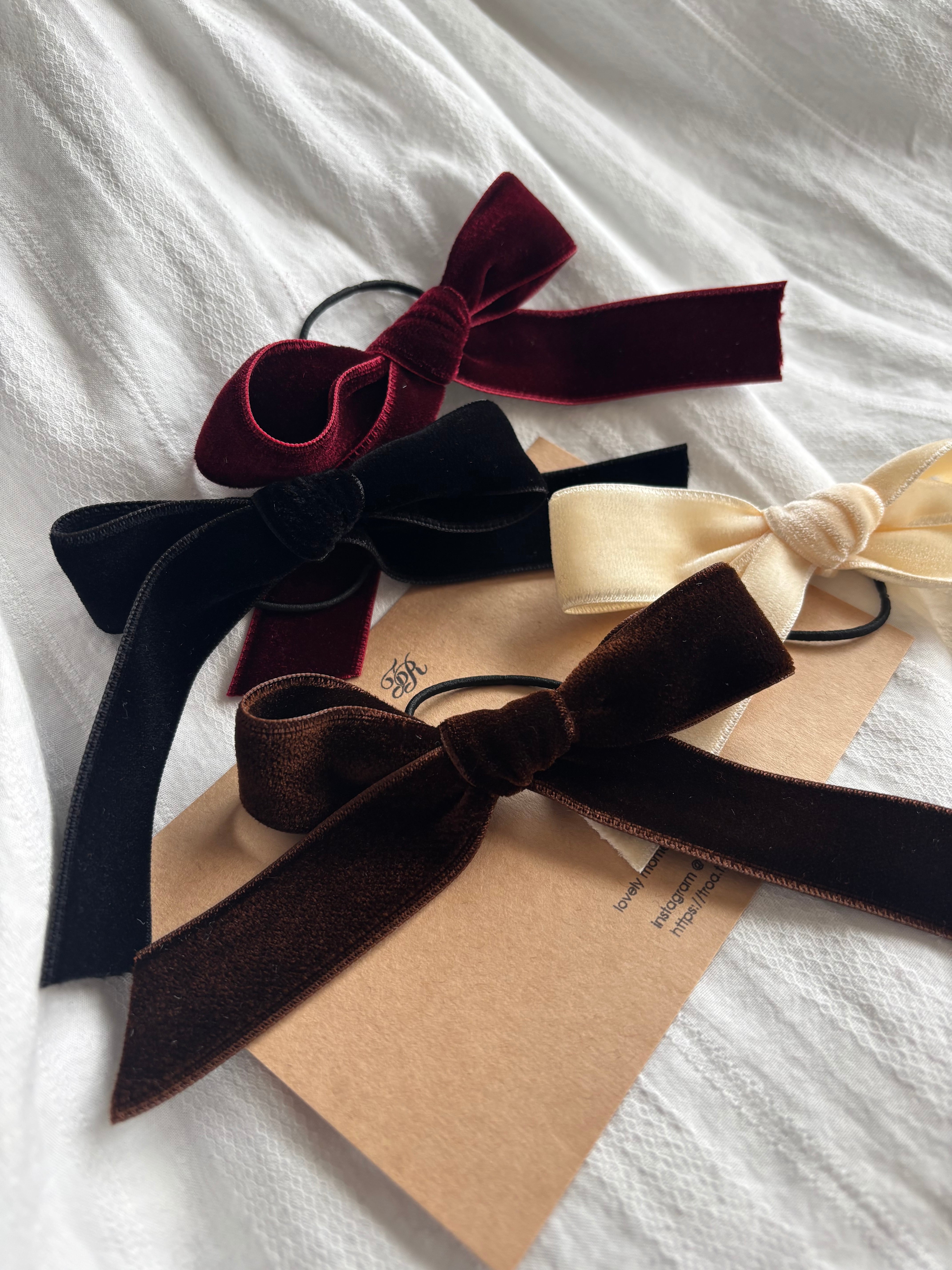 上品な光沢感のあるベルベット素材を使用した、大ぶりリボンのヘアゴム。