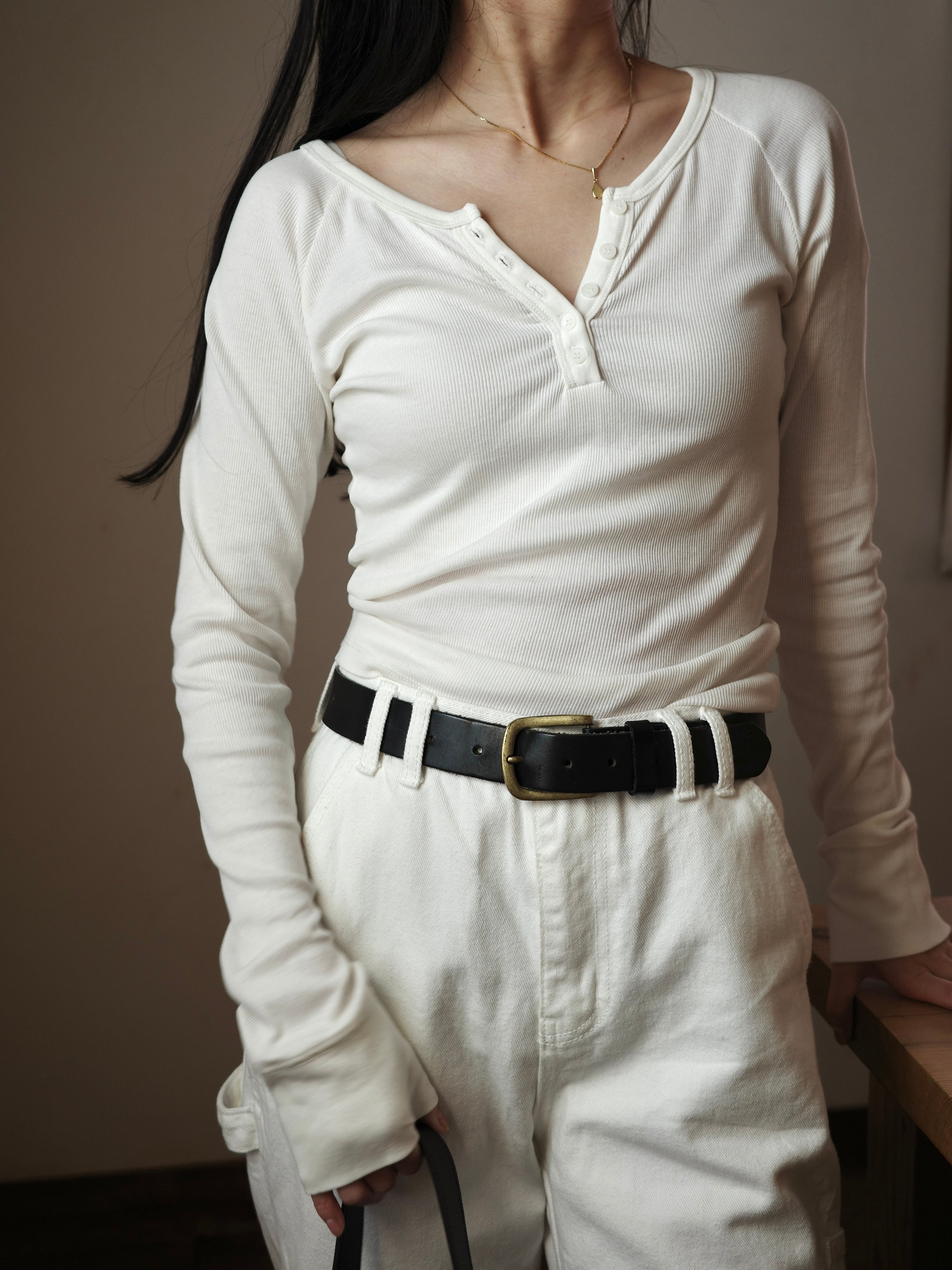 首元はヘンリーネック仕様で、ボタンの開き具合によって抜け感の調整ができ、さりげない女性らしさを演出します。