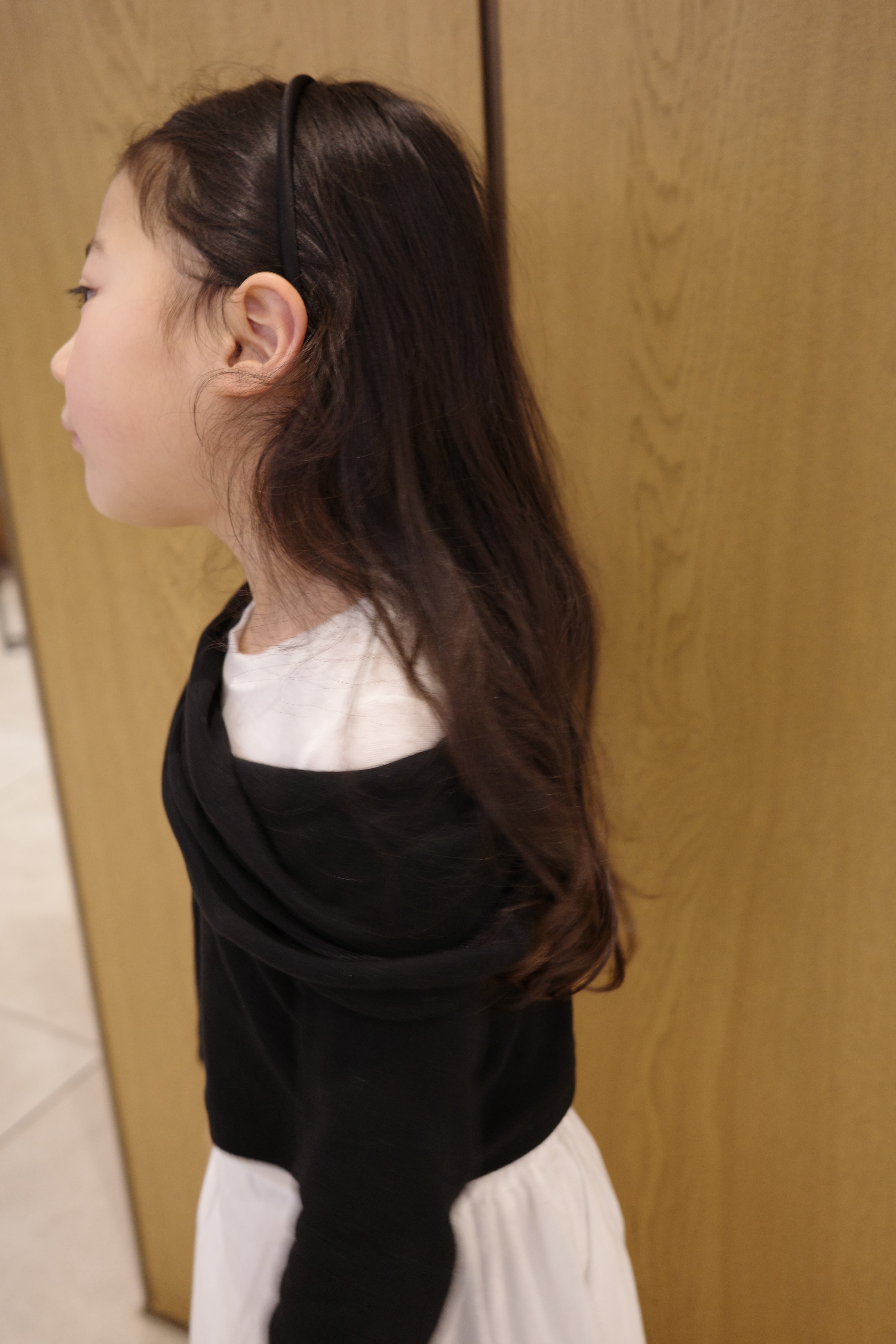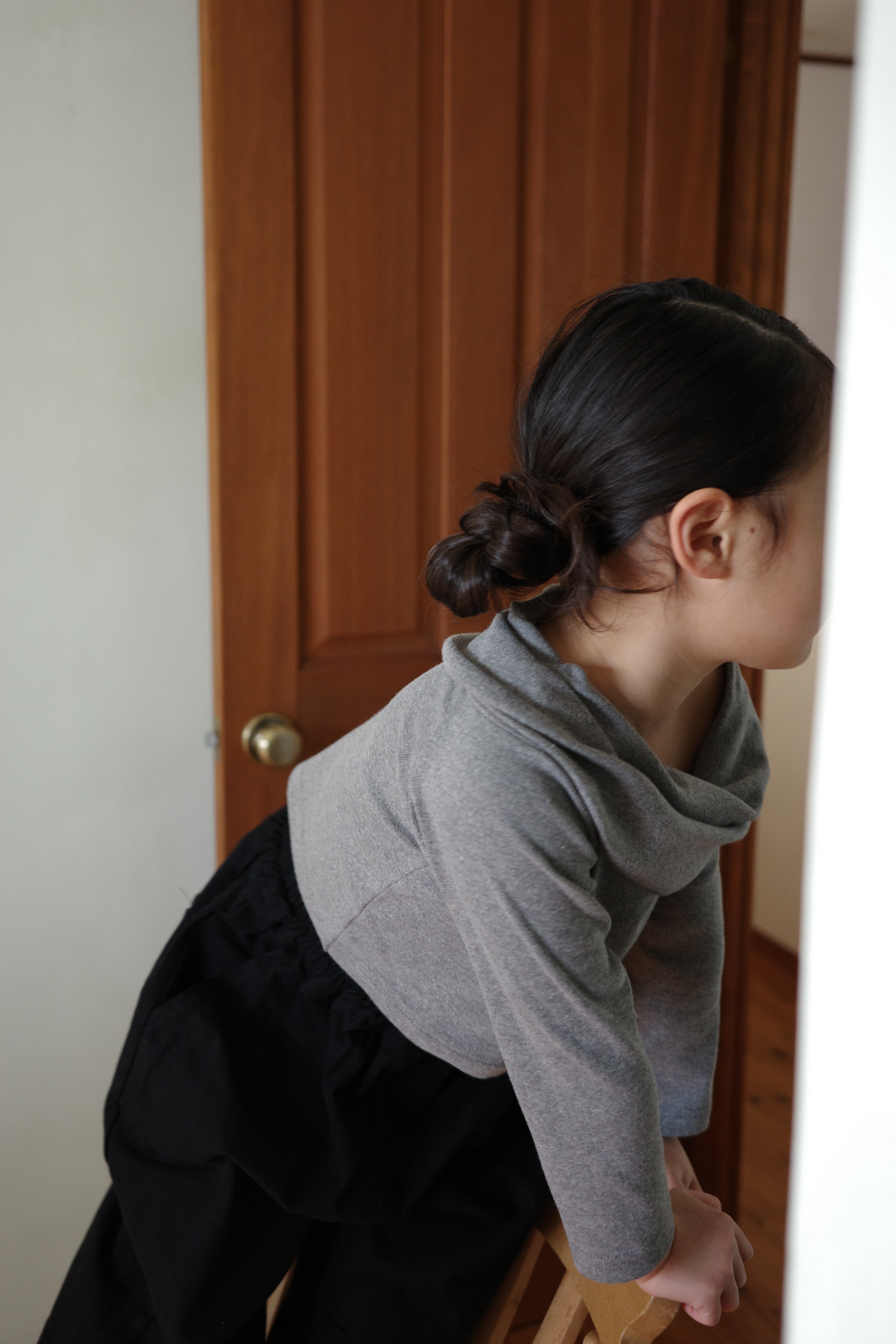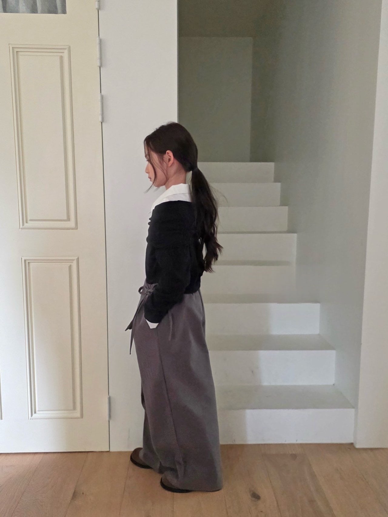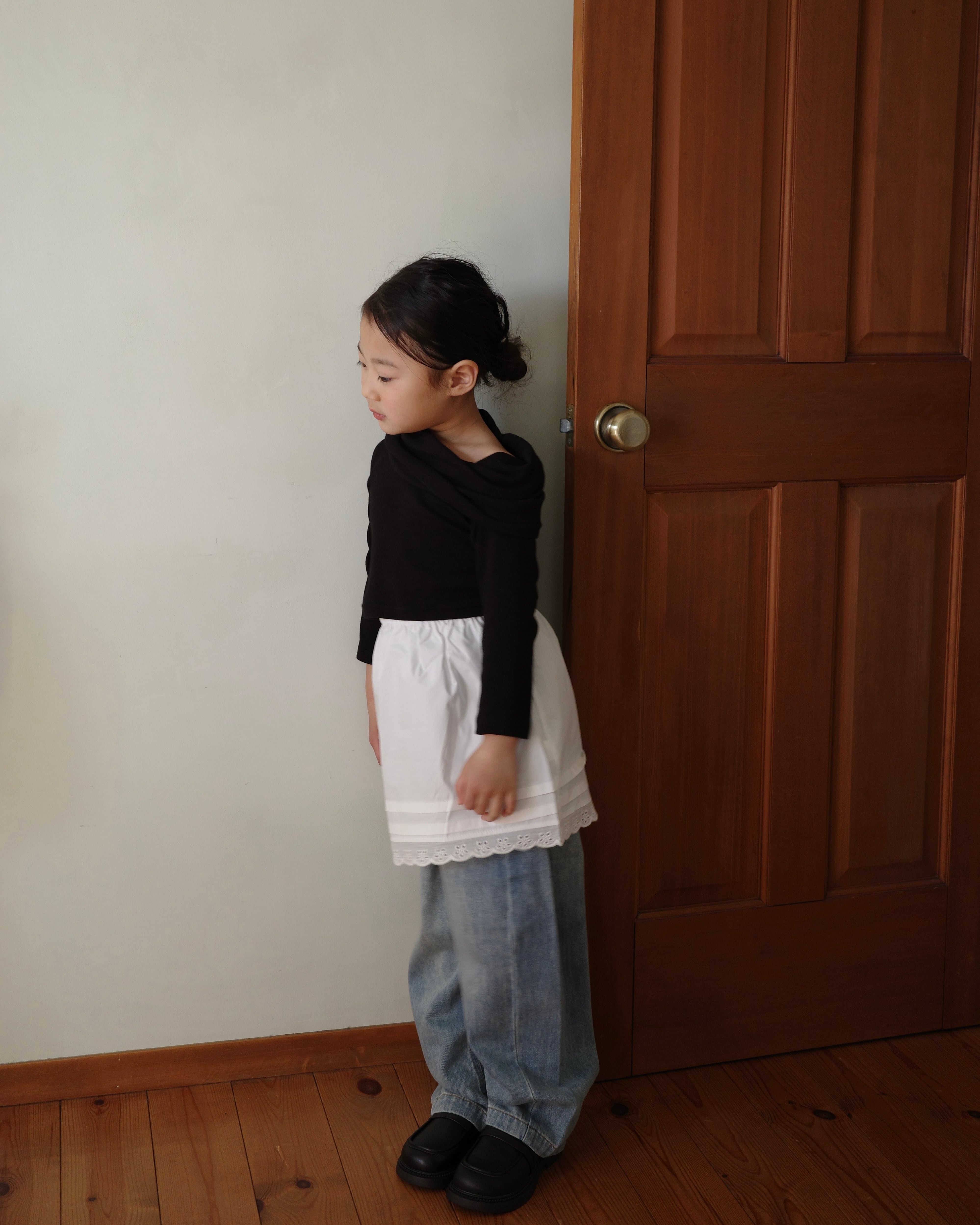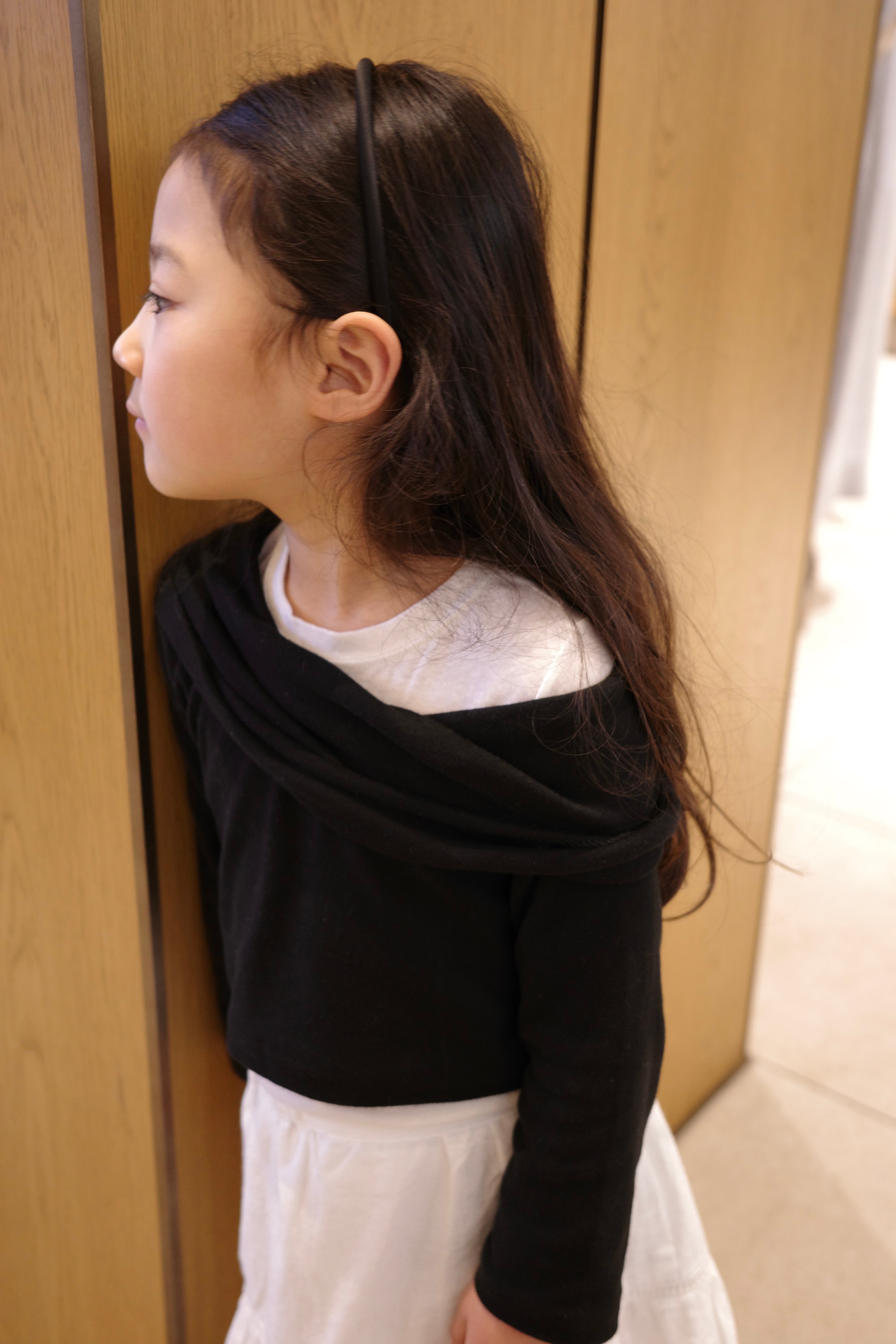 着丈が短めクロップド丈、ワンサイズ上げて着用しています。