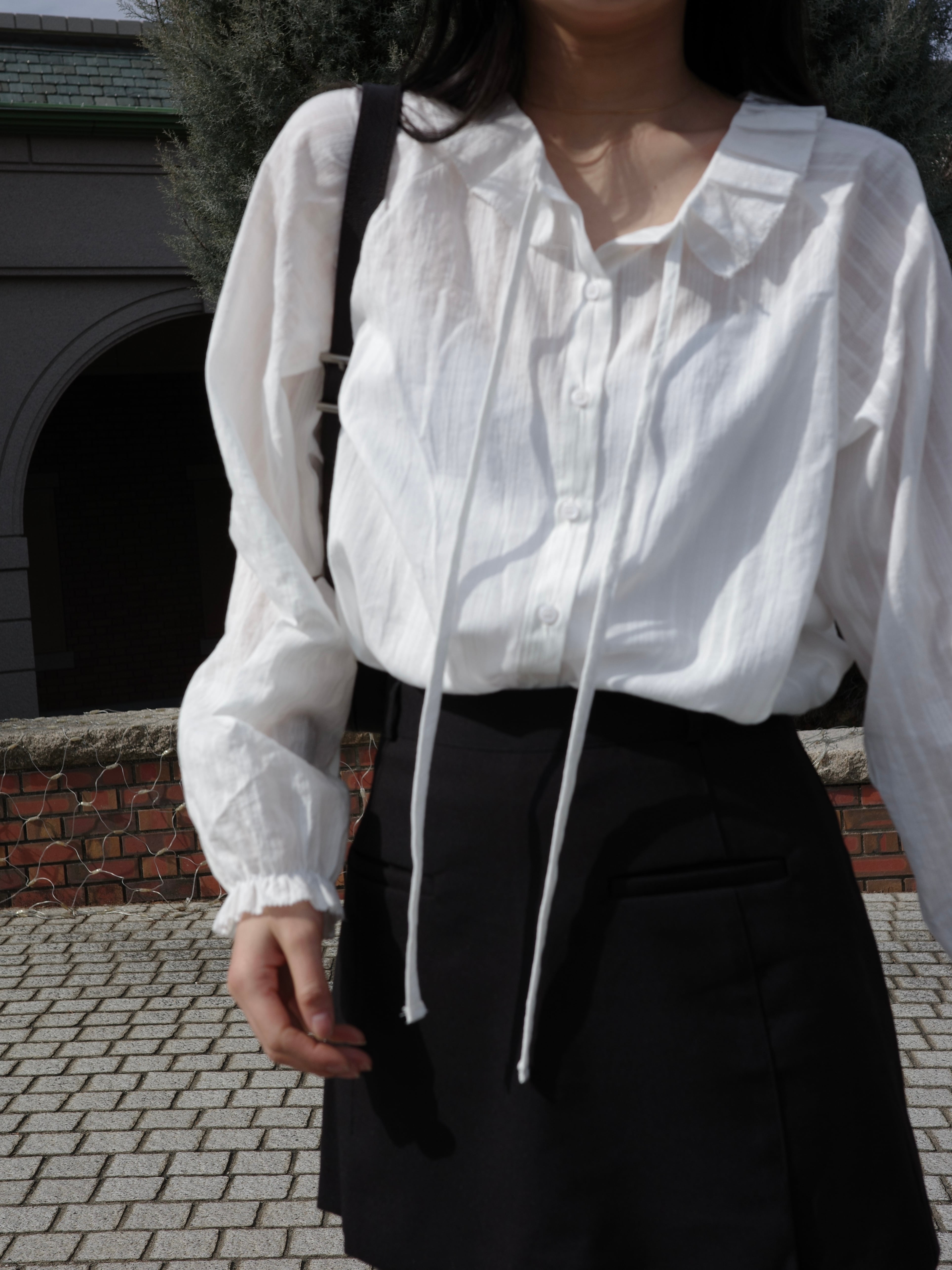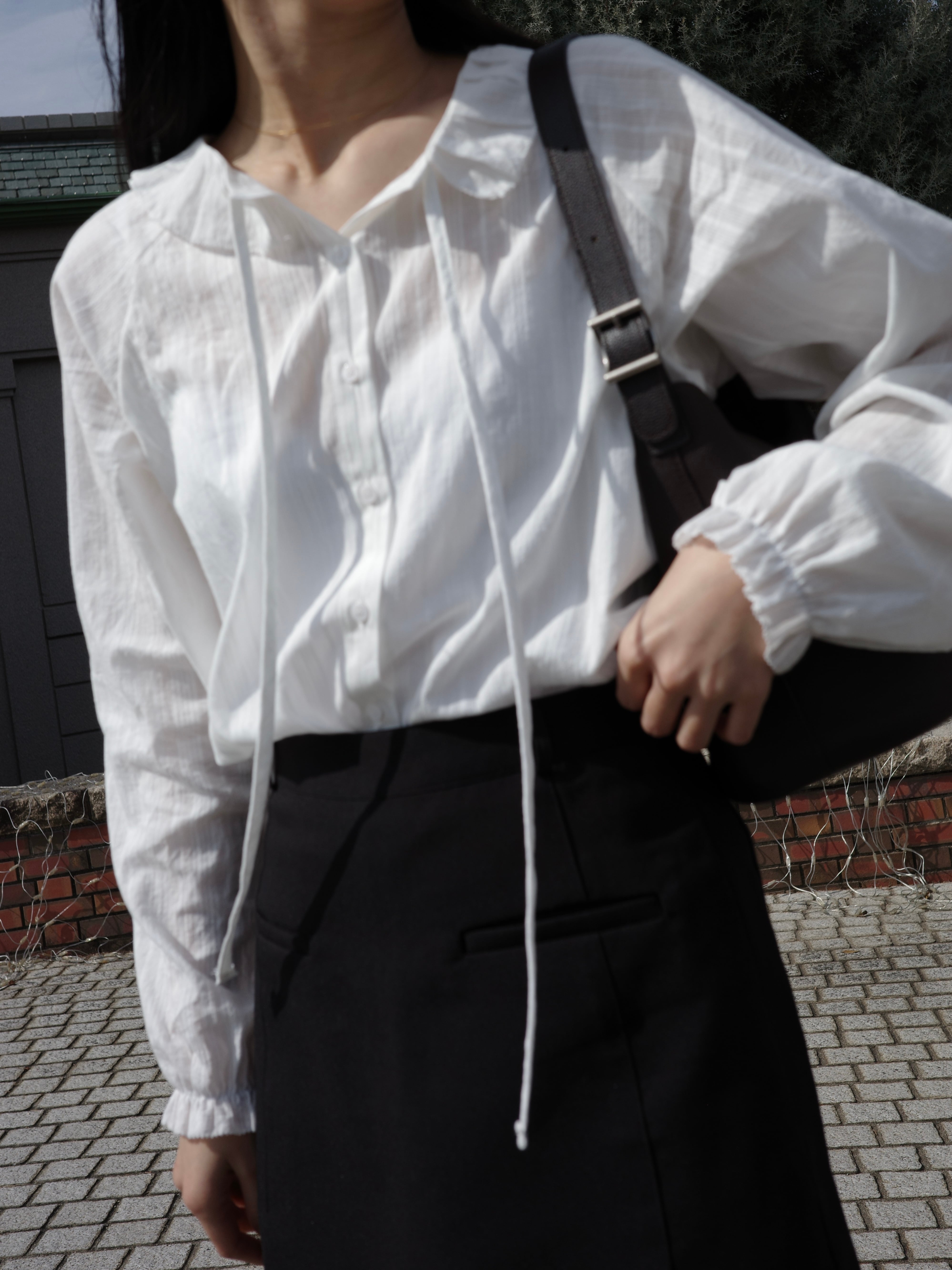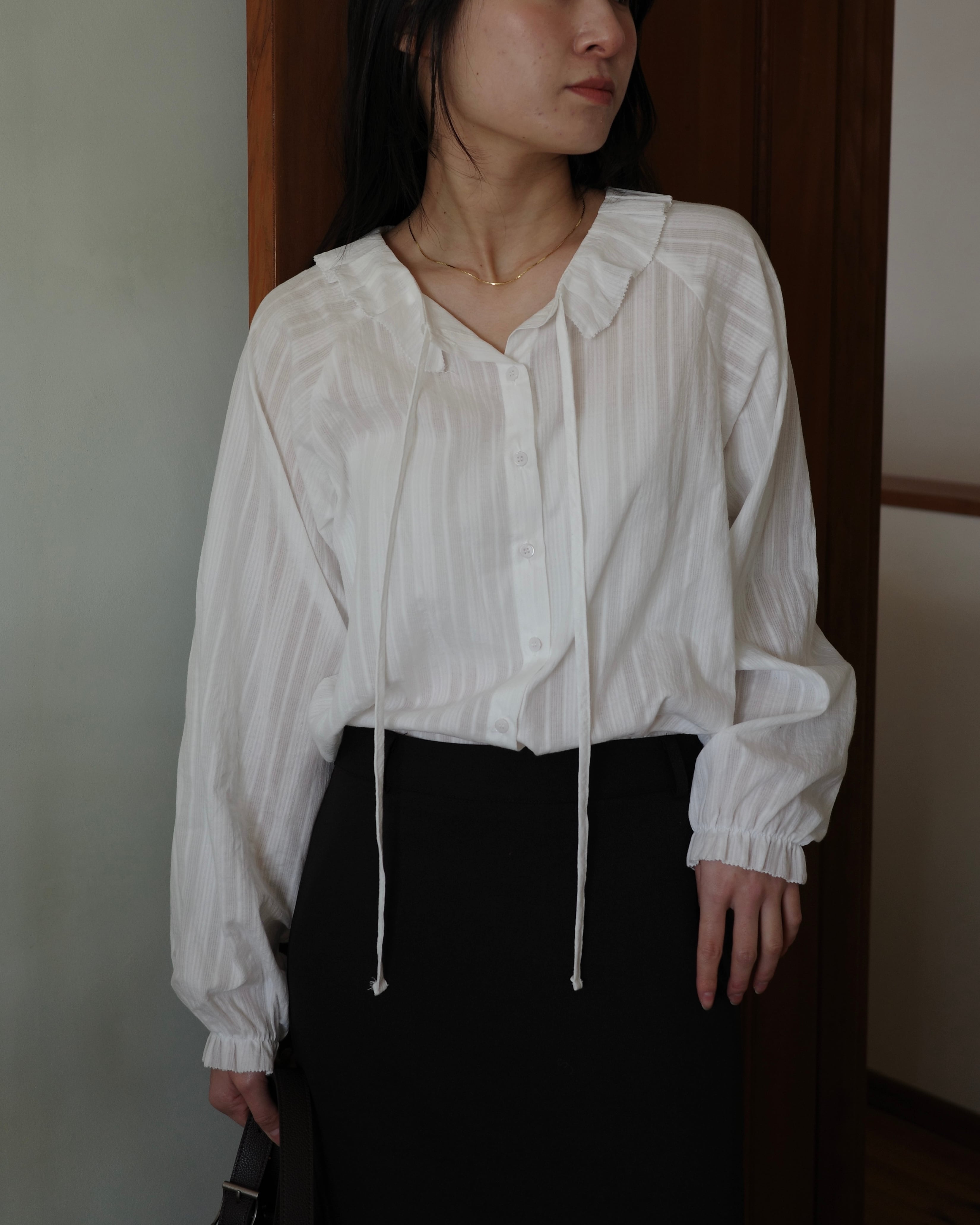 繊細なフリル襟が印象的なブラウス。