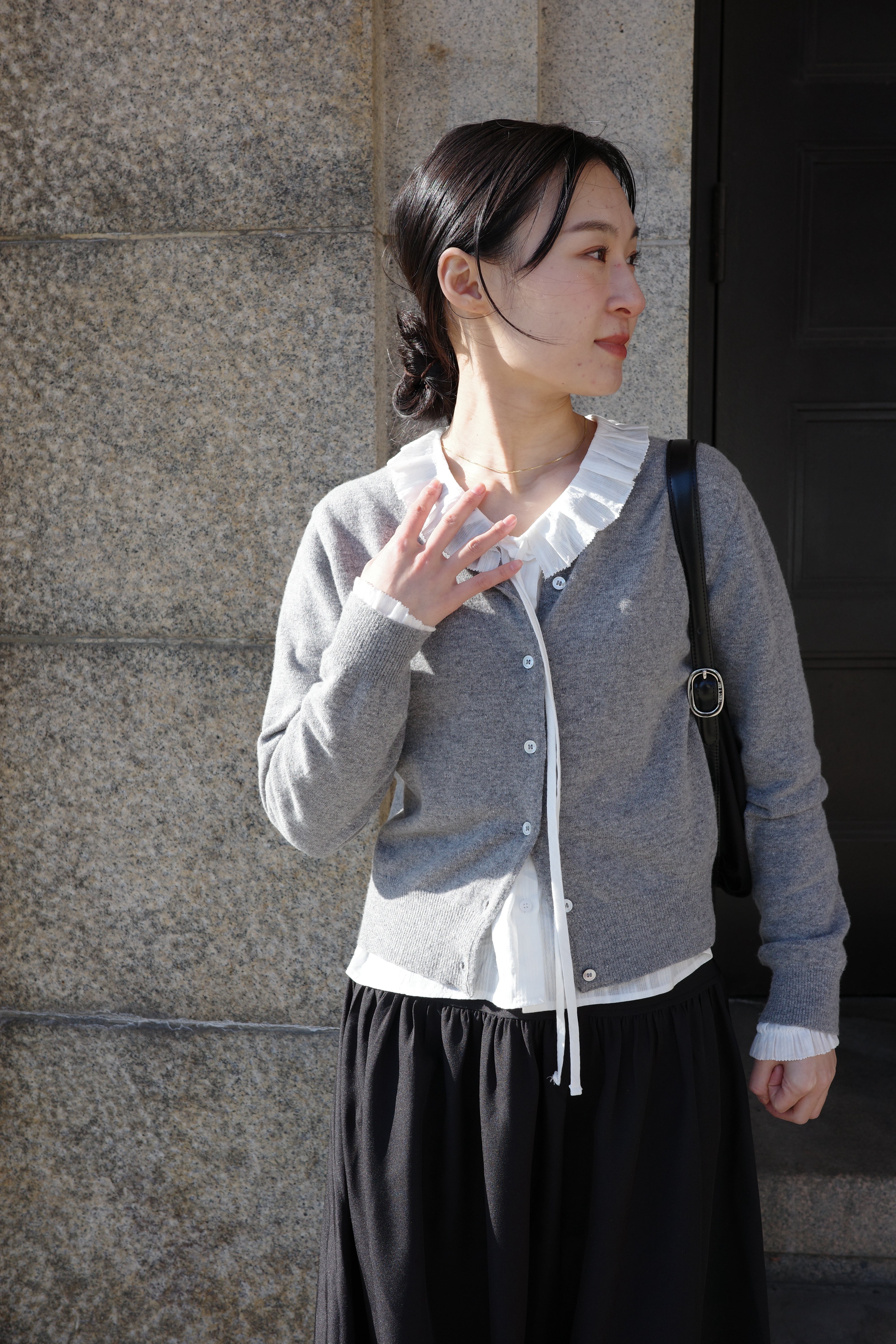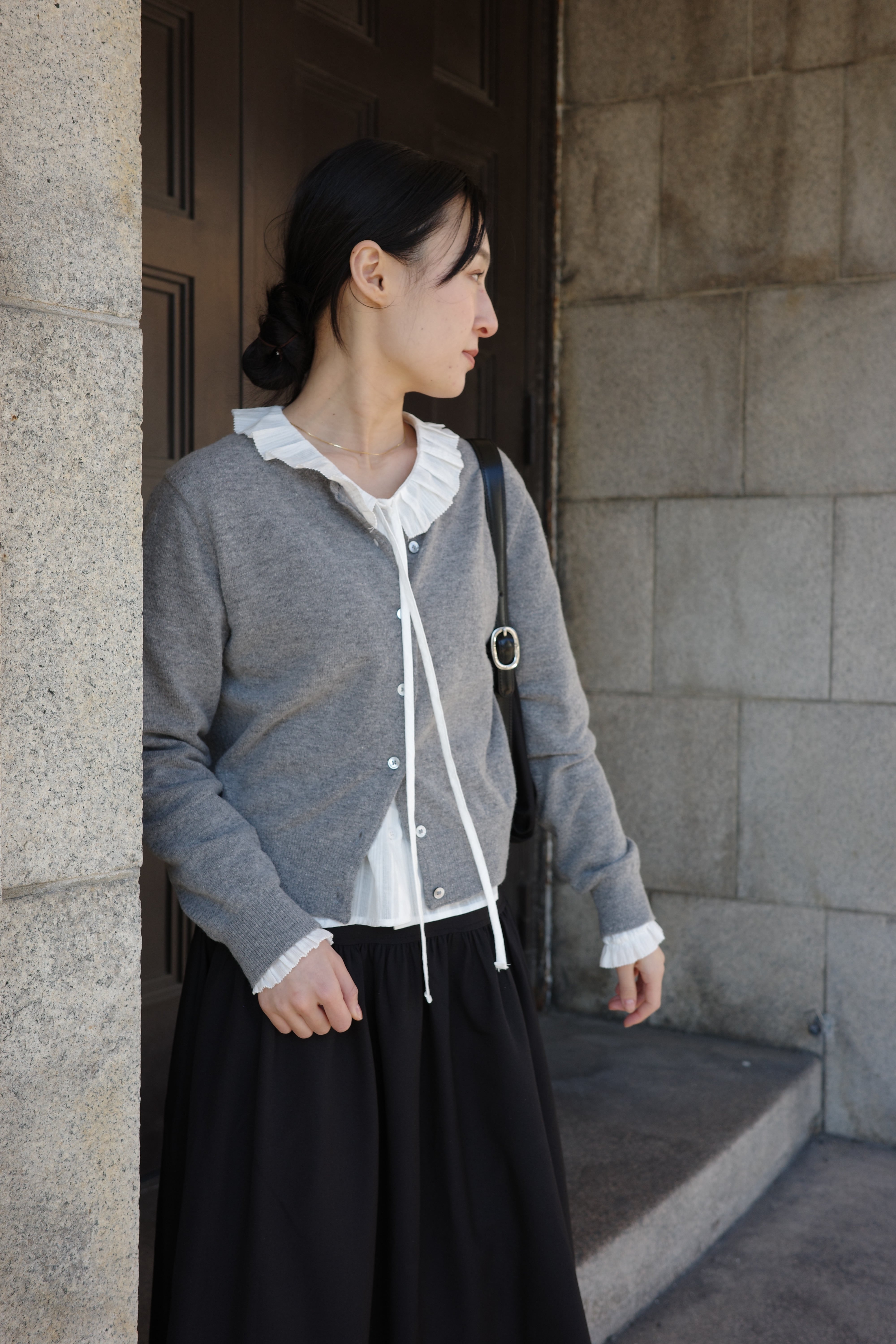 襟元のフリルがさりげないアクセントに。
