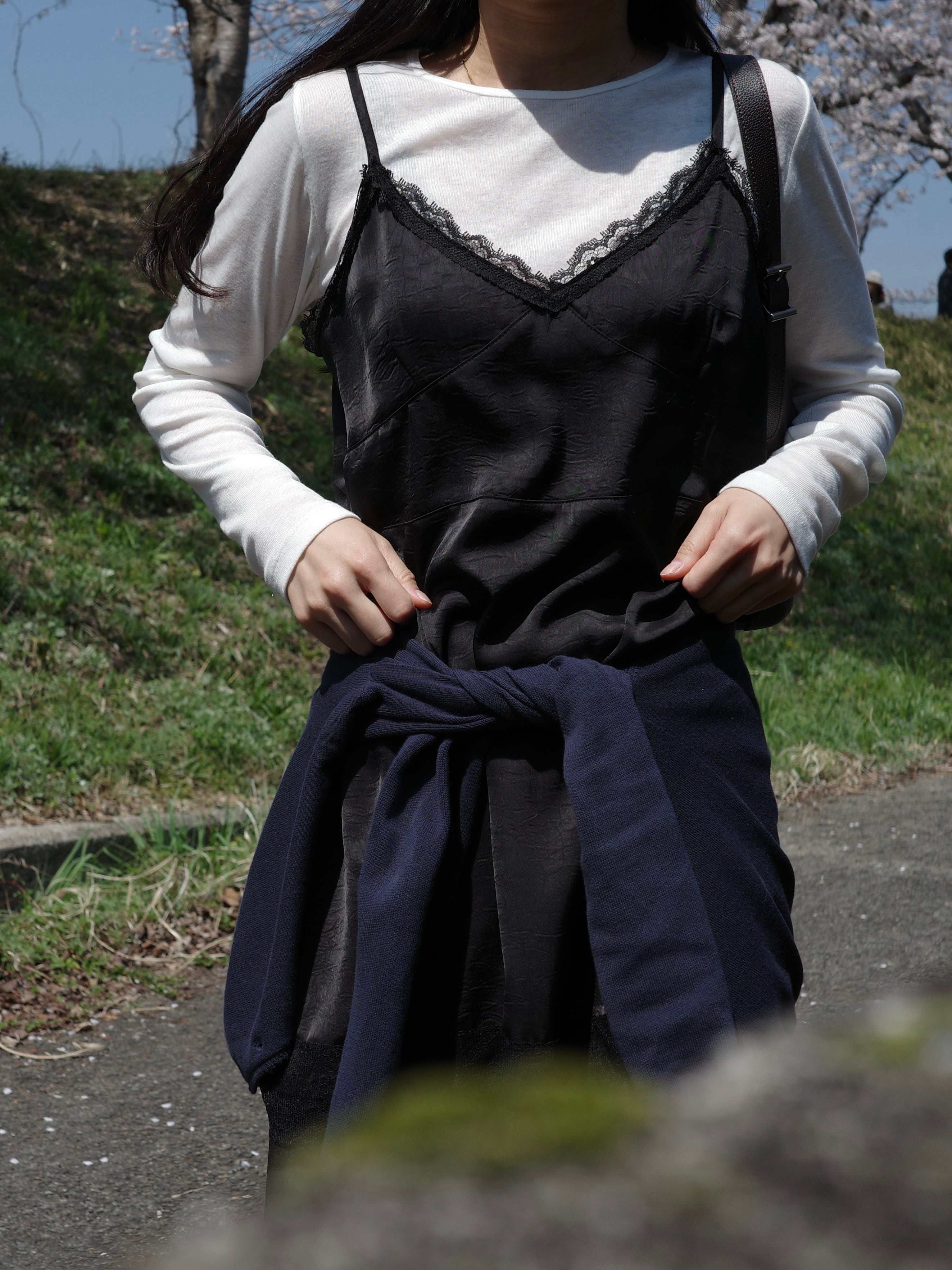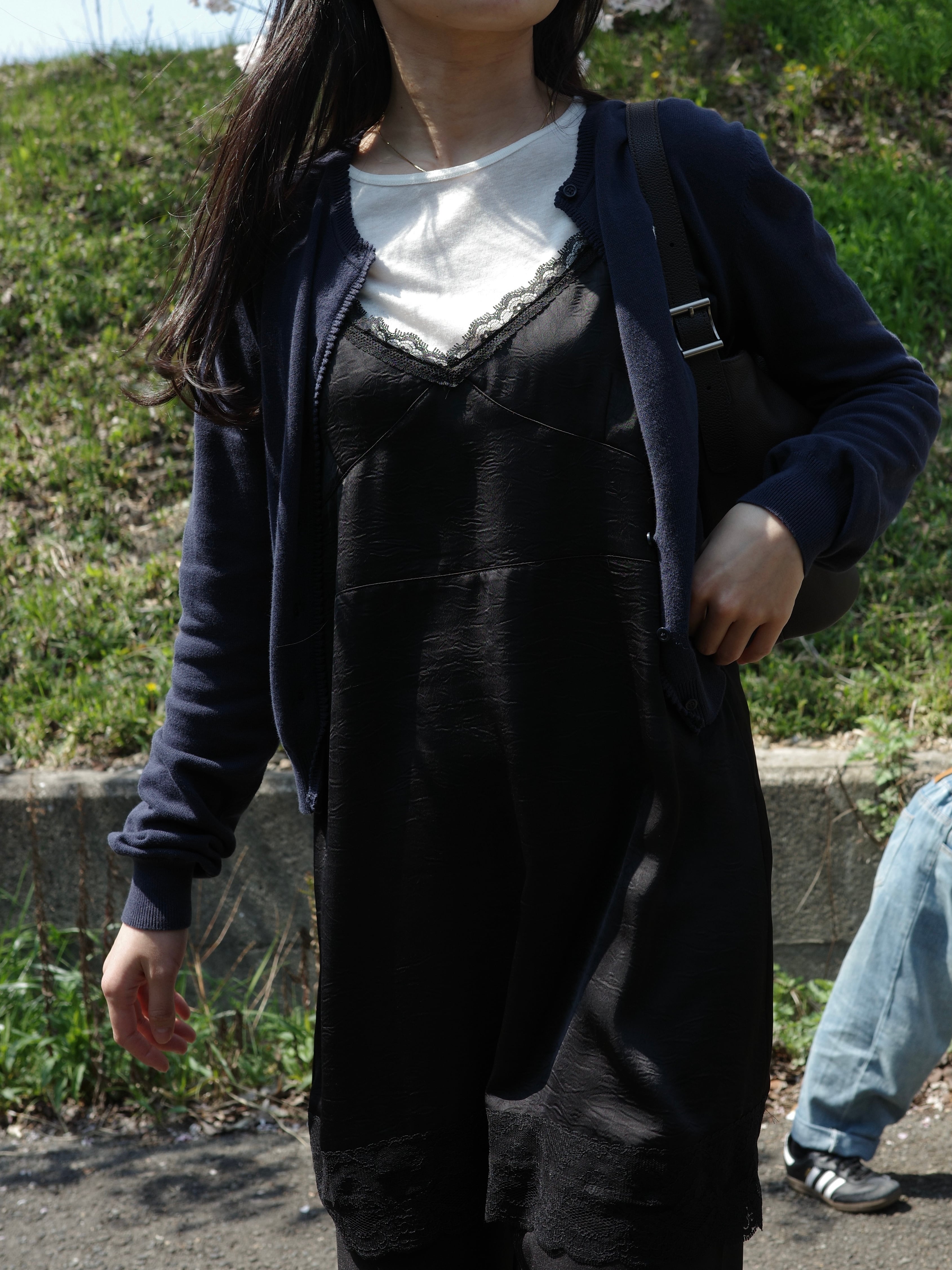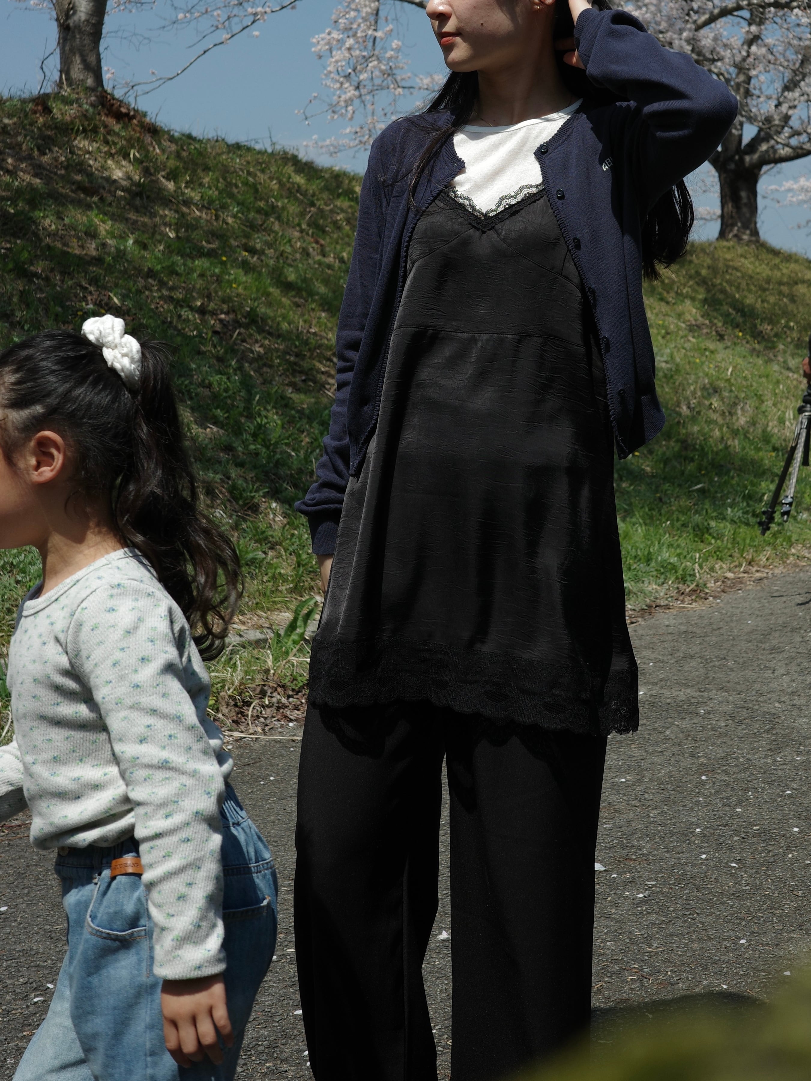 程よい艶感が美しい、サテン調のエンボス生地を使用したキャミワンピース。