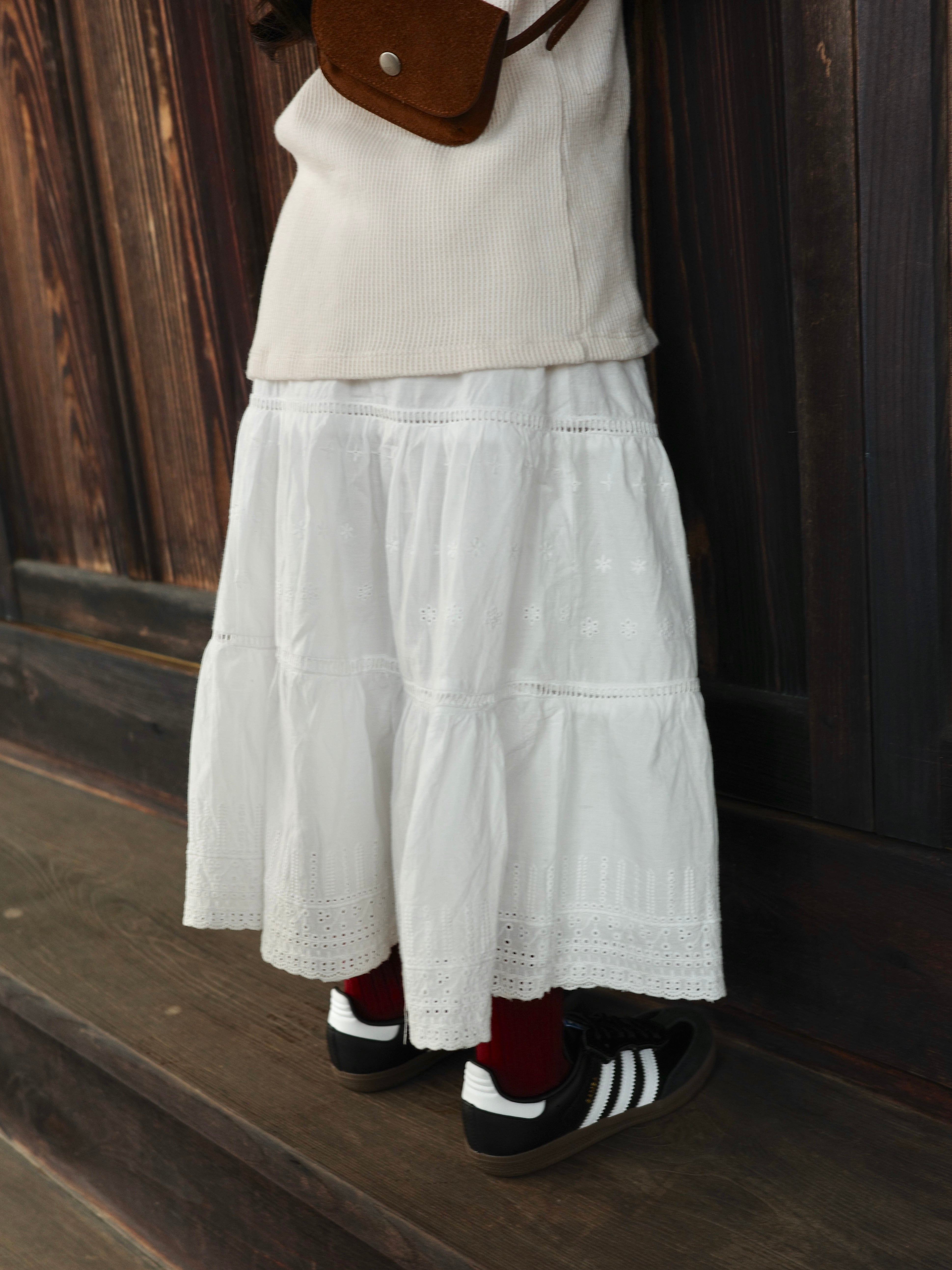 繊細な刺繍が可愛らしいコットンレースのティアードスカート